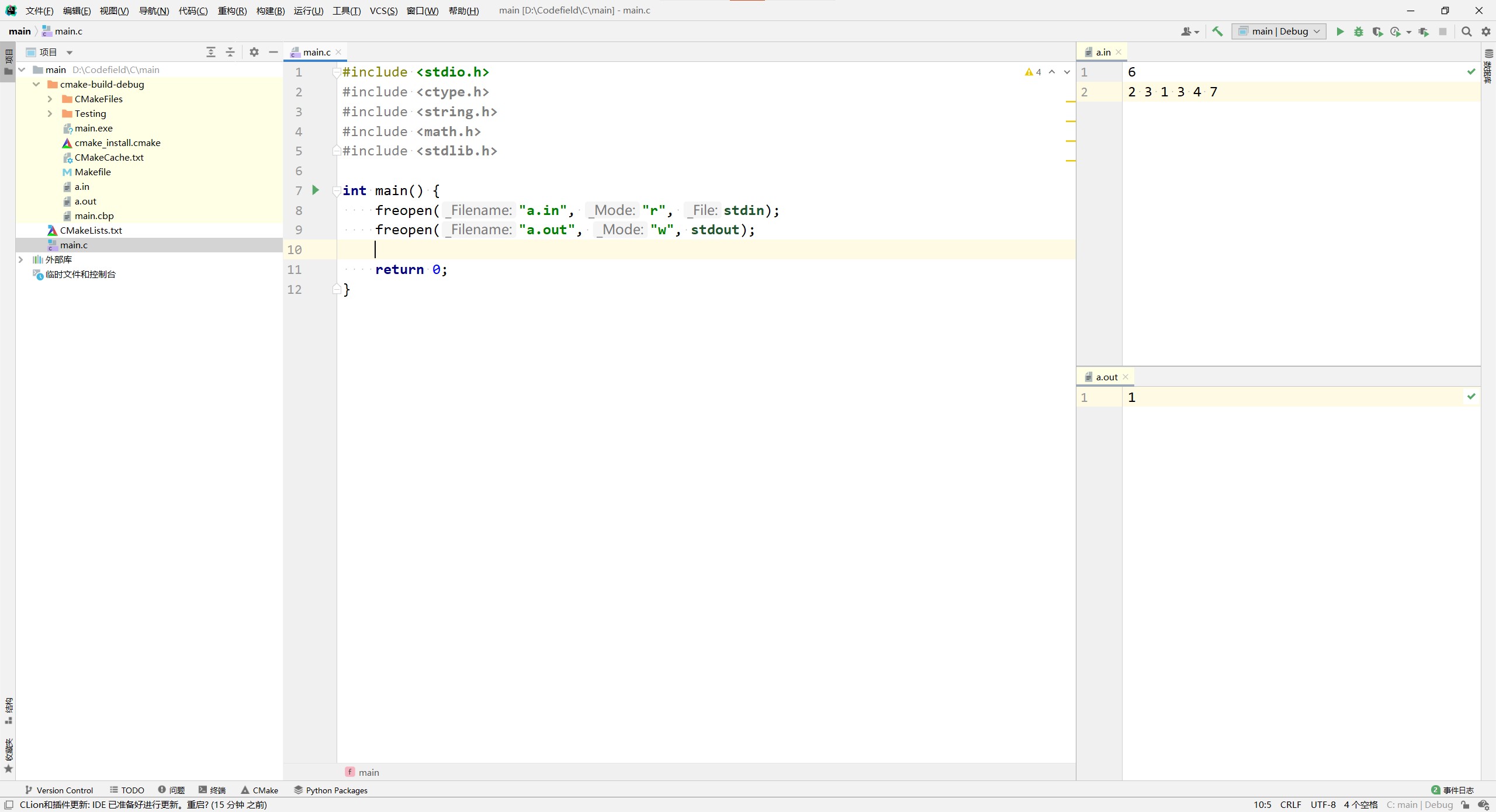 a.in和a.out应该是日常存放在cmake-build-debug里,一般不会在左边的文件目录栏里动了。a.in和a.out应该一直被打开放在你的右侧边栏,方便快速输入输出。- 写完代码准备提交的时候应该注释掉