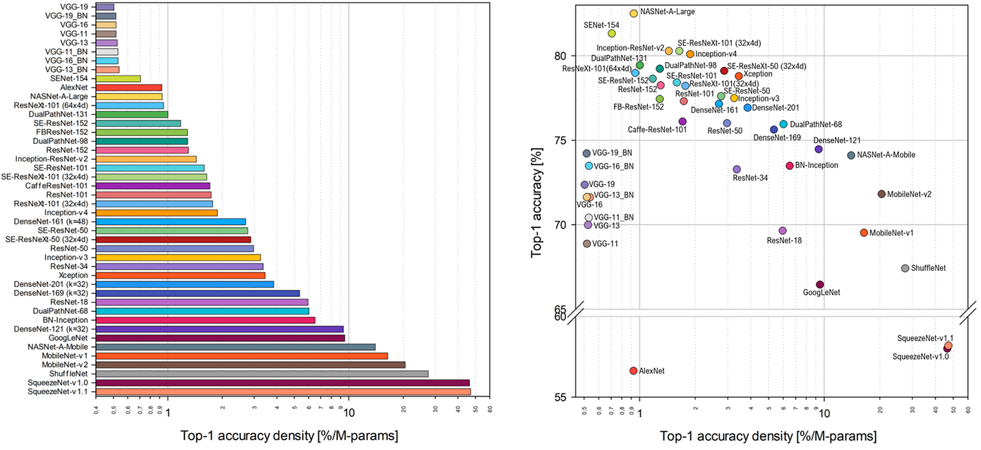 这两张图的左图表示的是,单位参数量对最终性能准确率的贡献,像VGG的参数效率就非常的低,而MobileNet、ShuffleNet这些轻量化网络的参数效率就相对较高,画成散点图就是右图。