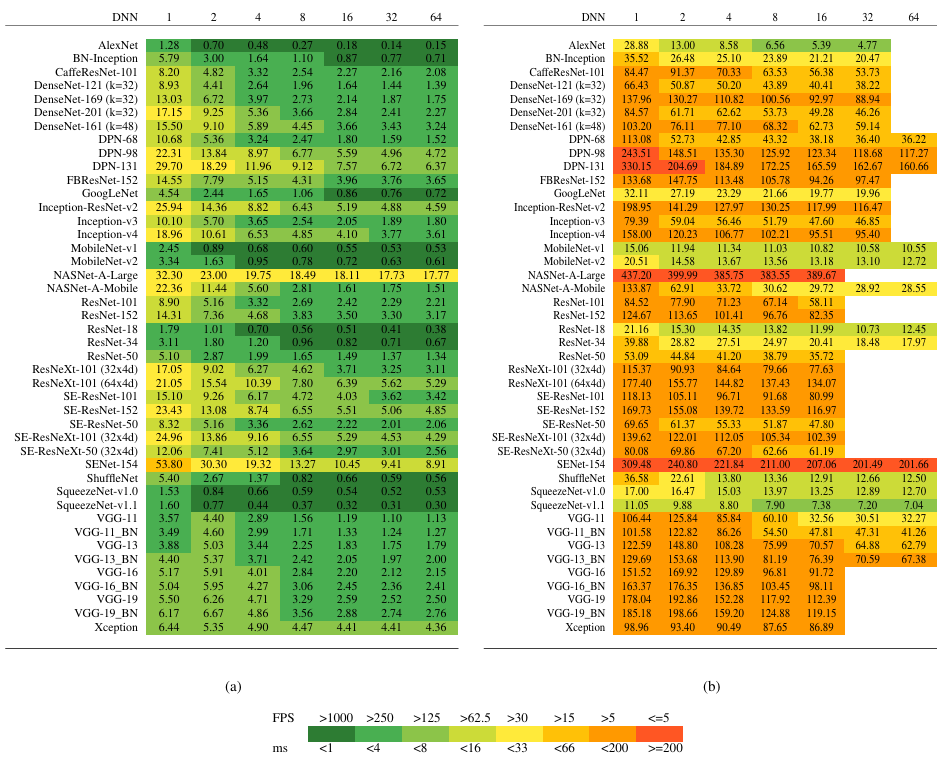 这张图展示了不同深度神经网络架构在两个硬件平台撒谎给你进行多个批次大小下的推理时间评估,同样也可以证明轻量化网络的优势。