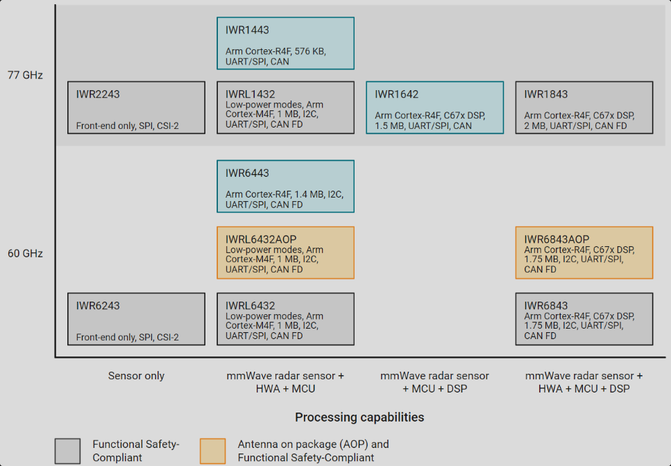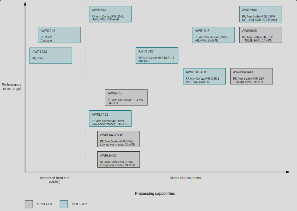 下图的纵轴为工作频段,分为77GHz和60GHz两个频段,横轴描述的是芯片集成的处理能力(Processing capabilities),从左到右,能力由弱到强。