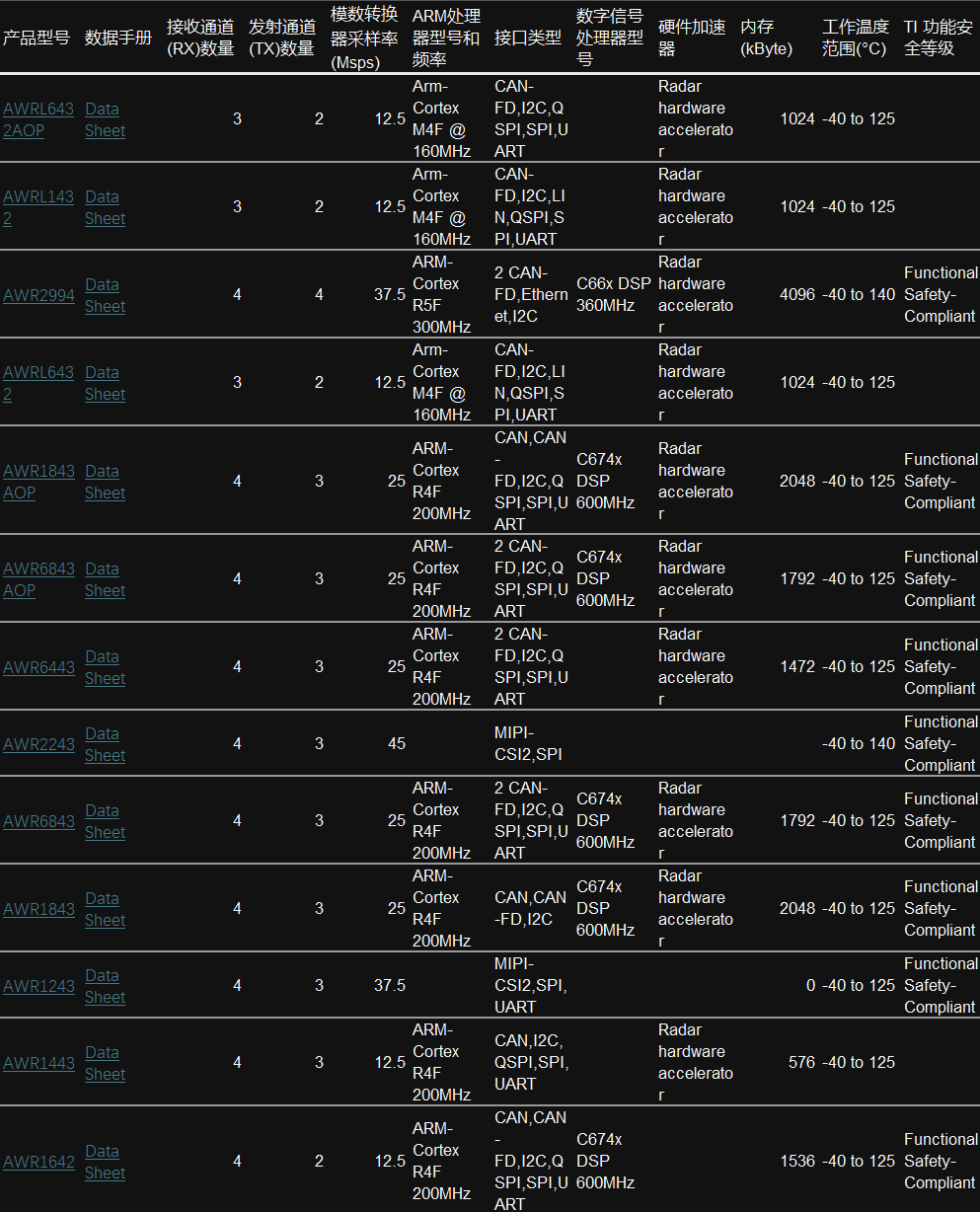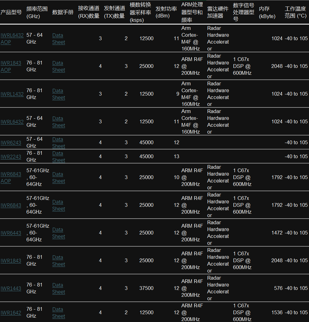 先从工业级毫米波雷达传感器开始选型,下图是TI官网的资料,TI的资料齐全也是选择TI毫米波雷达的原因之一。