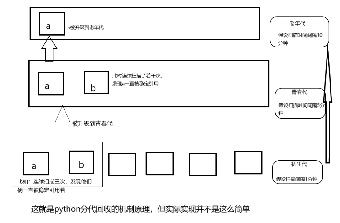 当某些内存块M经过了3次垃圾回收的清洗之后还是存活着的时候,就将内存块M划到一个集合A中去,当垃圾收集开始工作时,大多数情况只是针对集合B进行垃圾回收,而对集合A进行垃圾回收要隔相当长一段时间才进行,这就使得垃圾收集机制要处理的内存少了,效率自然就提高了。这个过程中集合B中的某些内存块由于存活时间长会被转移到A中, 当然A中实际上也存在一些垃圾,这些垃圾回收会因为这种分带机制而延迟。 在python中,一共有三代,也即维护3条链表(generation 0, 1, 2)