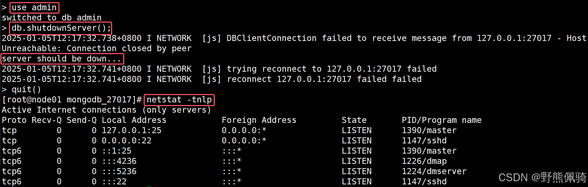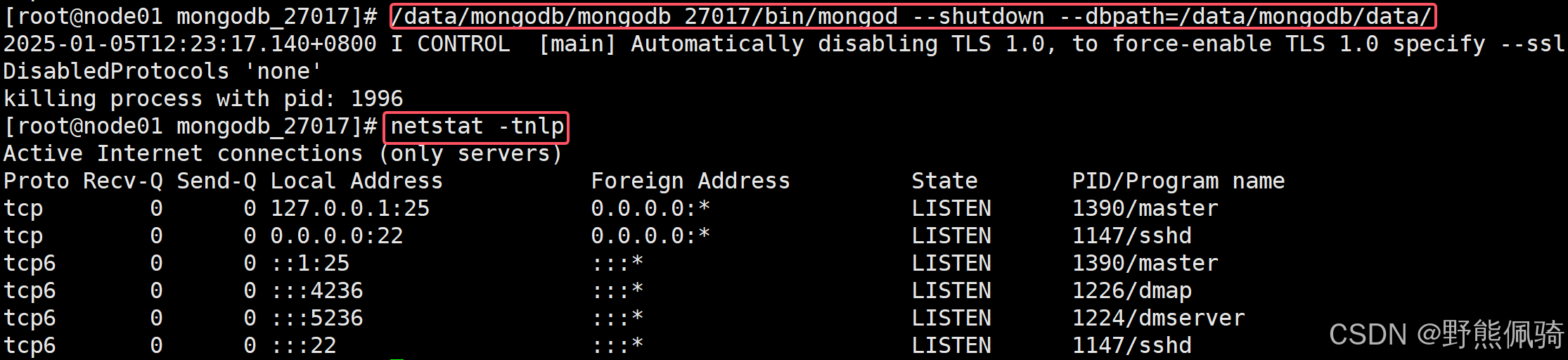 [root@node01 mongodb_27017]# /data/mongodb/mongodb_27017/bin/mongod --shutdown --dbpath=/data/mongodb/data/