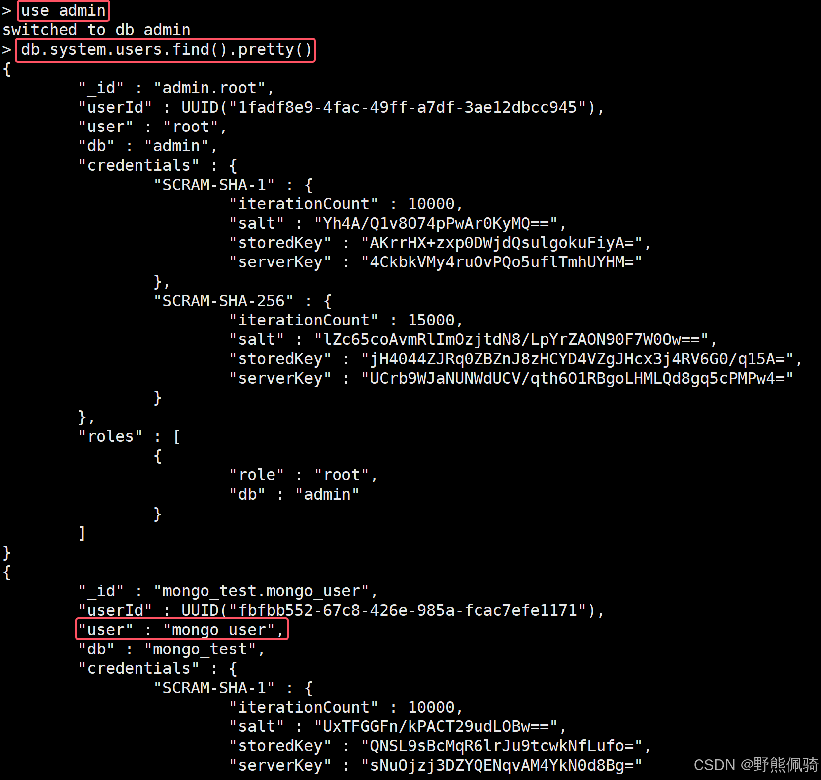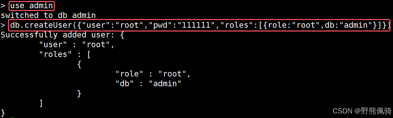 > db.createUser({"user":"root","pwd":"111111","roles":[{role:"root",db:"admin"}]})