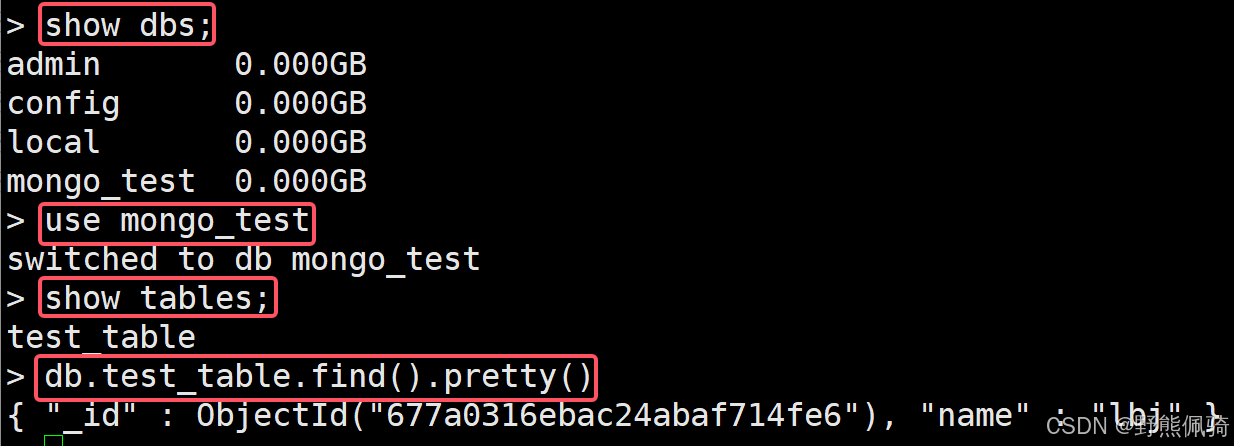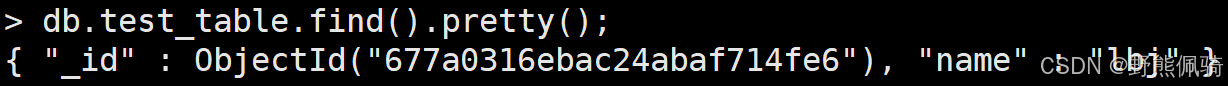 { "_id" : ObjectId("677a0316ebac24abaf714fe6"), "name" : "lbj" }