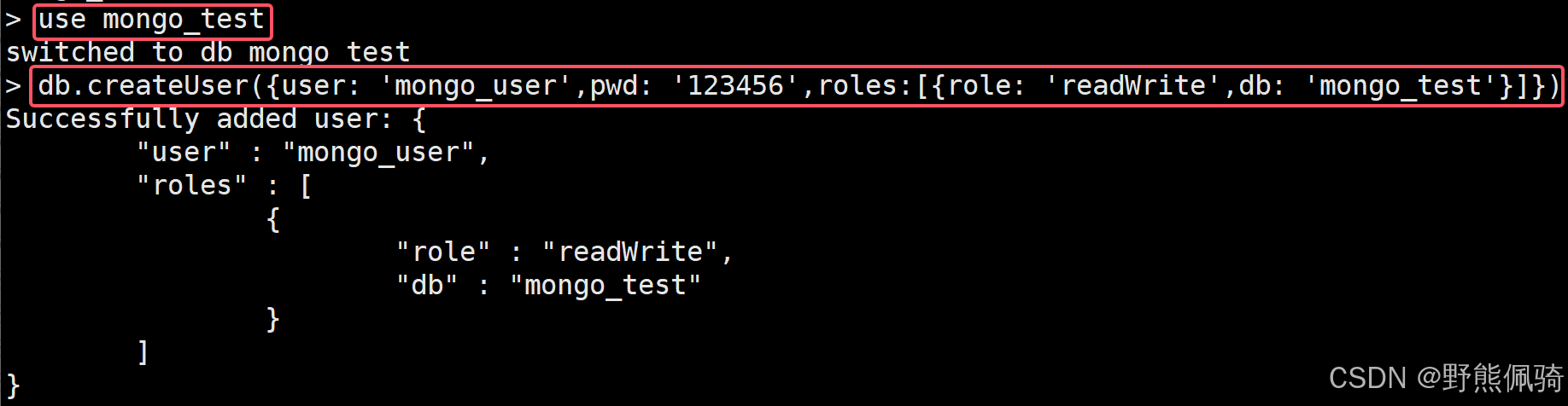 > db.createUser({user: 'mongo_user',pwd: '123456',roles:[{role: 'readWrite',db: 'mongo_test'}]})