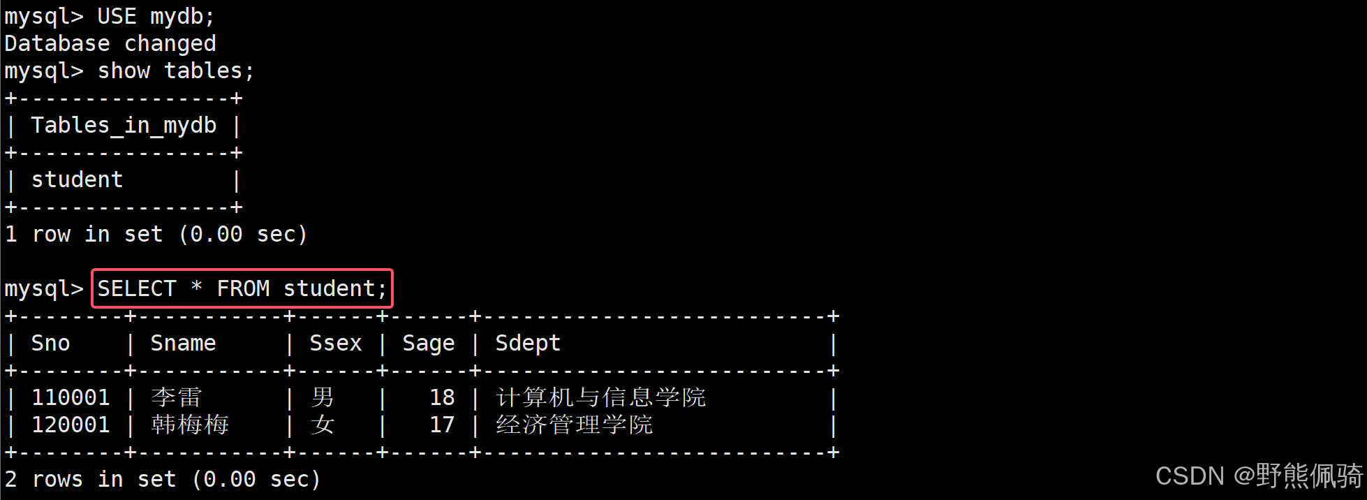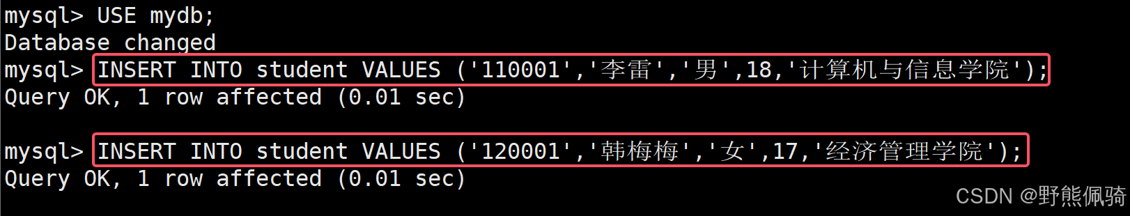 mysql> INSERT INTO student VALUES ('110001','李雷','男',18,'计算机与信息学院');mysql> INSERT INTO student VALUES ('120001','韩梅梅','女',17,'经济管理学院');