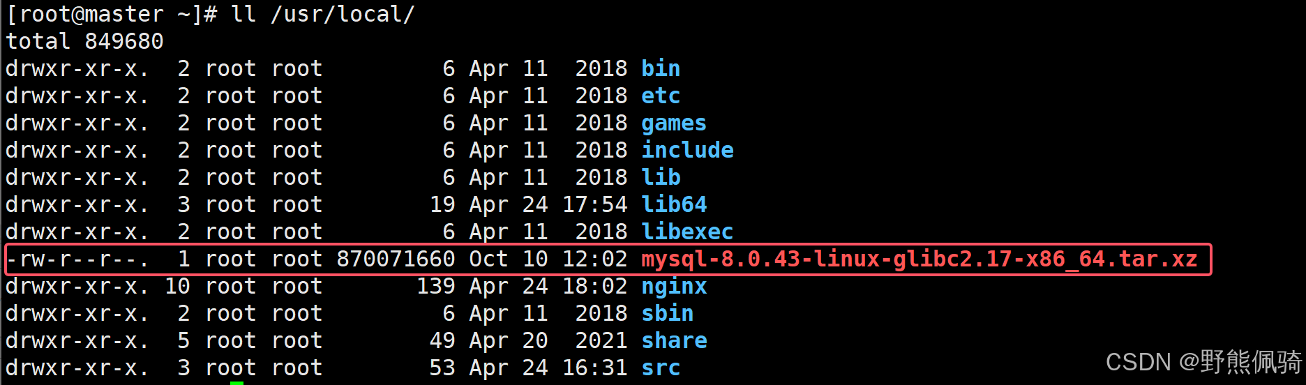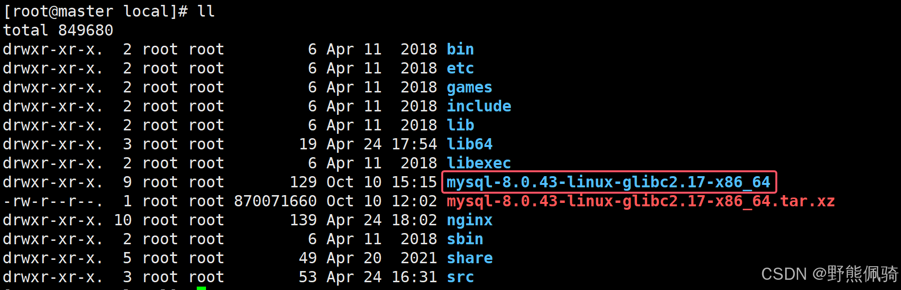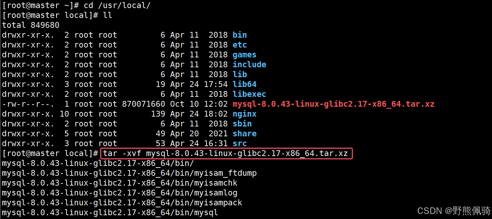 [root@master local]# tar -xvf mysql-8.0.43-linux-glibc2.17-x86_64.tar.xz