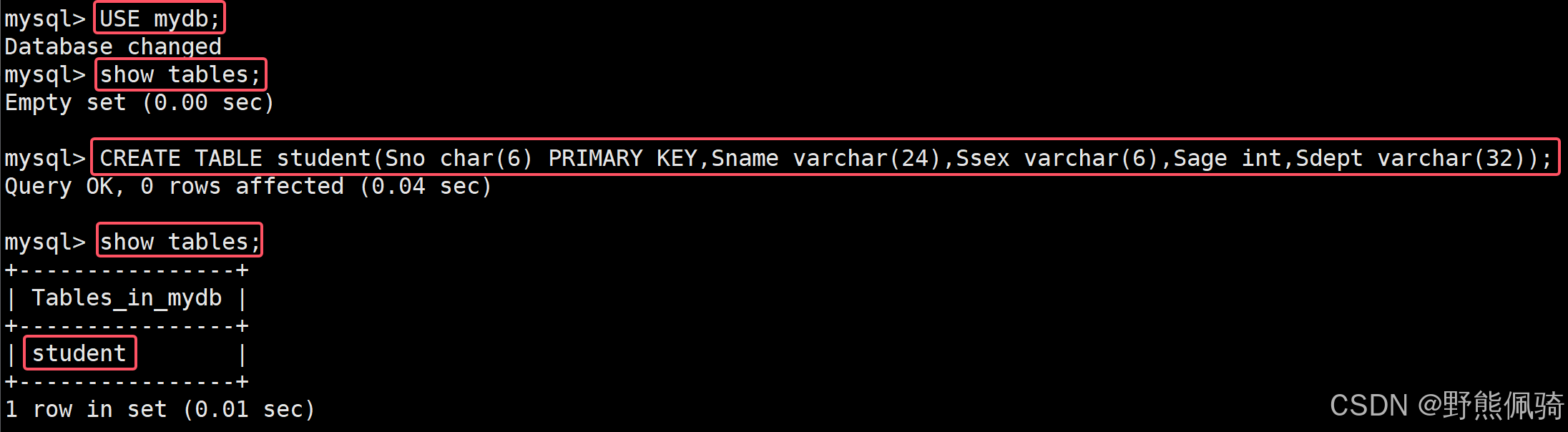 mysql> CREATE TABLE student(Sno char(6) PRIMARY KEY,Sname varchar(24),Ssex varchar(6),Sage int,Sdept varchar(32));