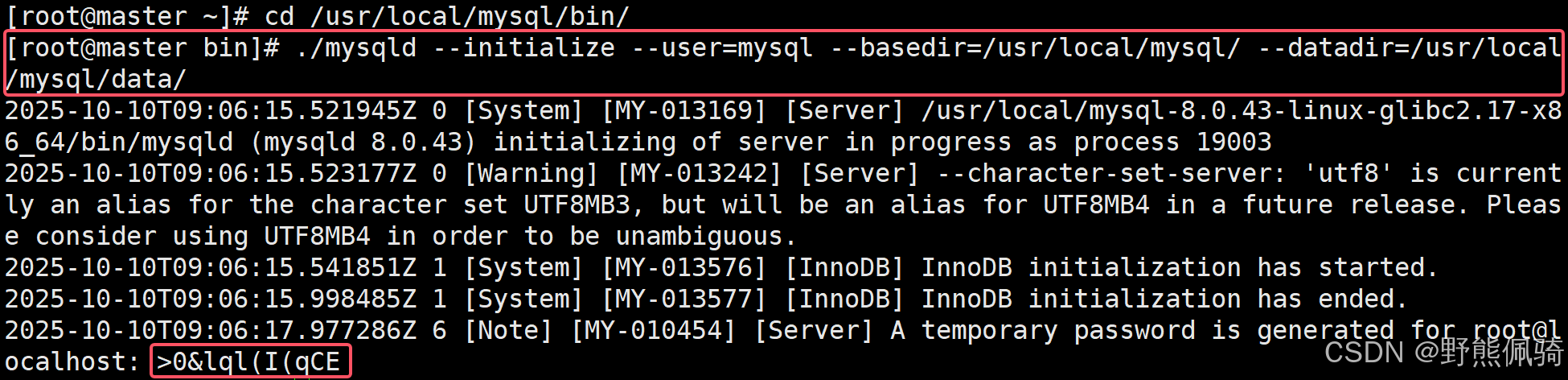 [root@master bin]# ./mysqld --initialize --user=mysql --basedir=/usr/local/mysql/ --datadir=/usr/local/mysql/data/