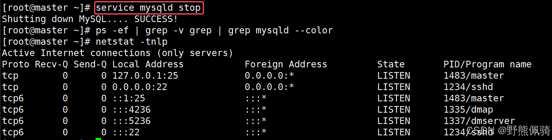 由上可见,kill掉MySQL服务进程后,MySQL服务进程已经查询不到,且3306端口已经关闭。