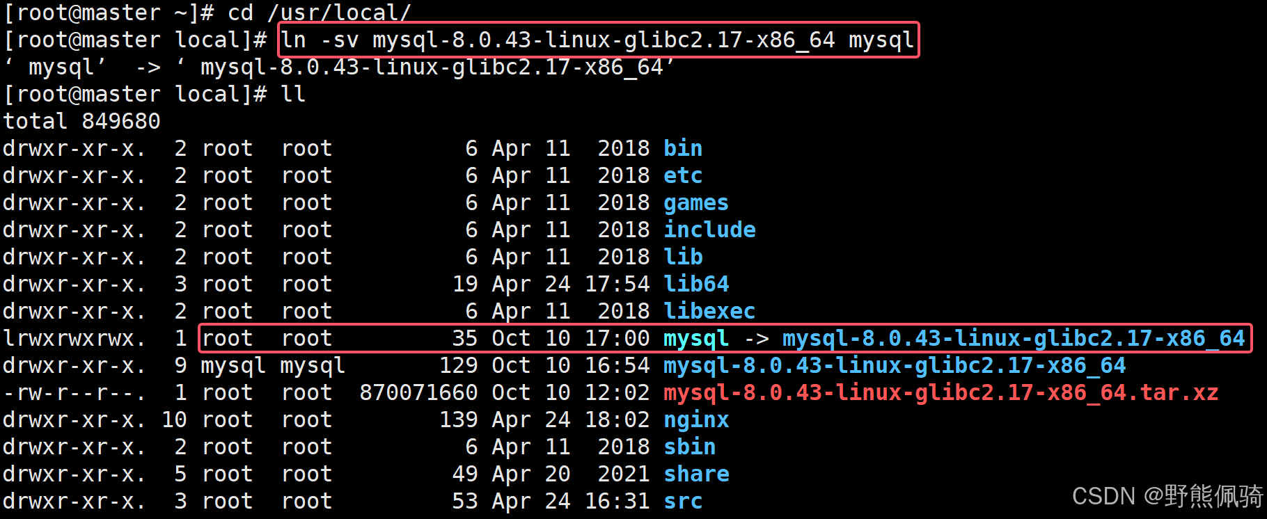 [root@master local]# ln -sv mysql-8.0.43-linux-glibc2.17-x86_64 mysql