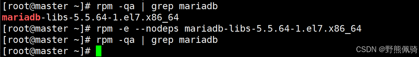 [root@master ~]# rpm -e --nodeps mariadb-libs-5.5.64-1.el7.x86_64