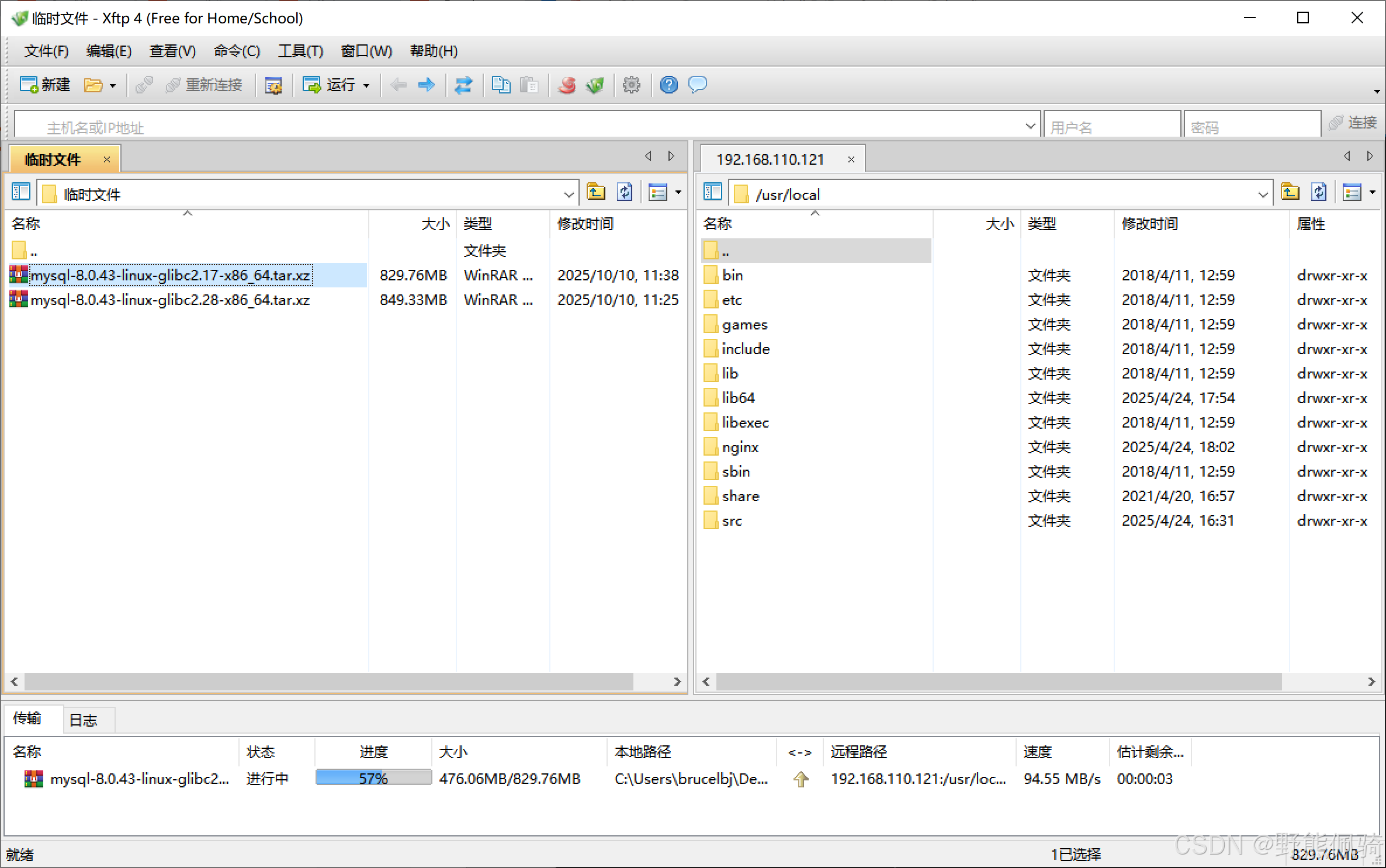 此处将MySQL安装包mysql-8.0.43-linux-glibc2.17-x86_64.tar.xz上传至服务器/usr/local路径下。