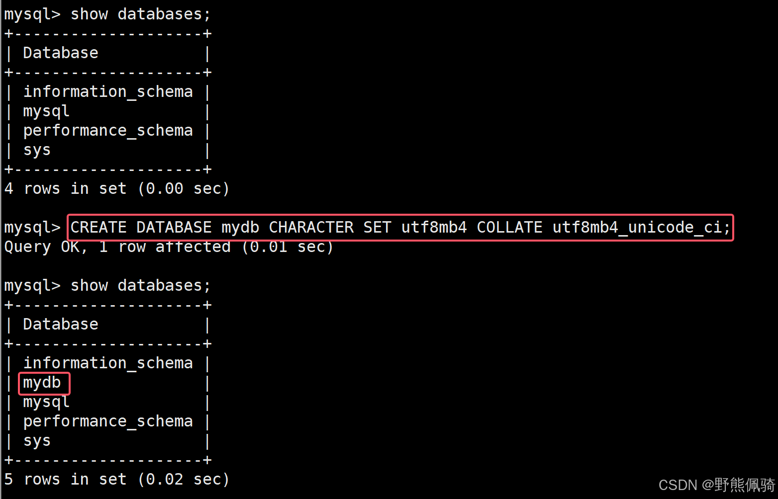 创建字符集为utf8mb4、校对规则为utf8mb4_unicode_ci的数据库mydb。