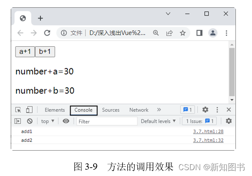 在Chrome浏览器中运行程序,打开控制台,单击a+1按钮,可以发现控制台调用了add1()和add2()方法,如图3-9所示。