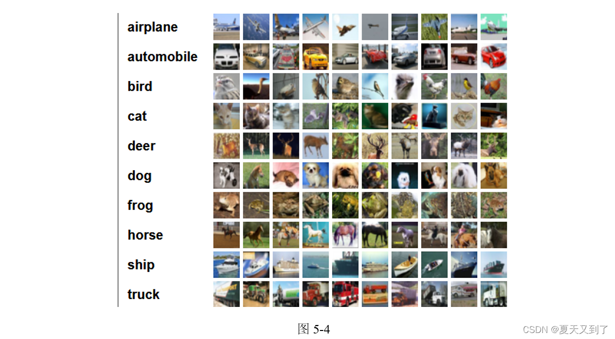 在本项目中,我们的目的是用 PyTorch 创建基于 CIFAR-10 数据集的图像分类器。CIFAR-10图像数据集共有60 000幅彩色图像,这些图像是32×32的,分为10个类,分别是airplane、automobile、bird、cat等,每类6 000幅图,如图5-4所示。这里面有50 000幅训练图像,10 000幅测试图像。