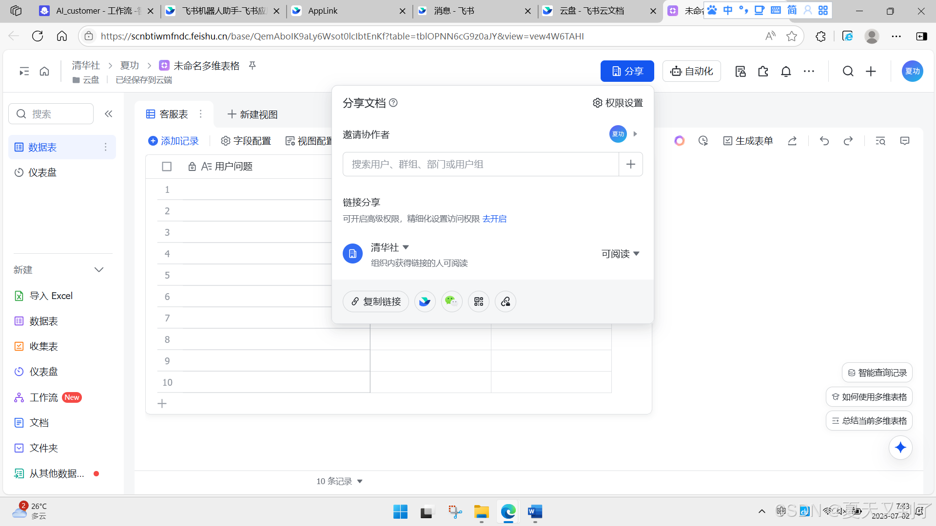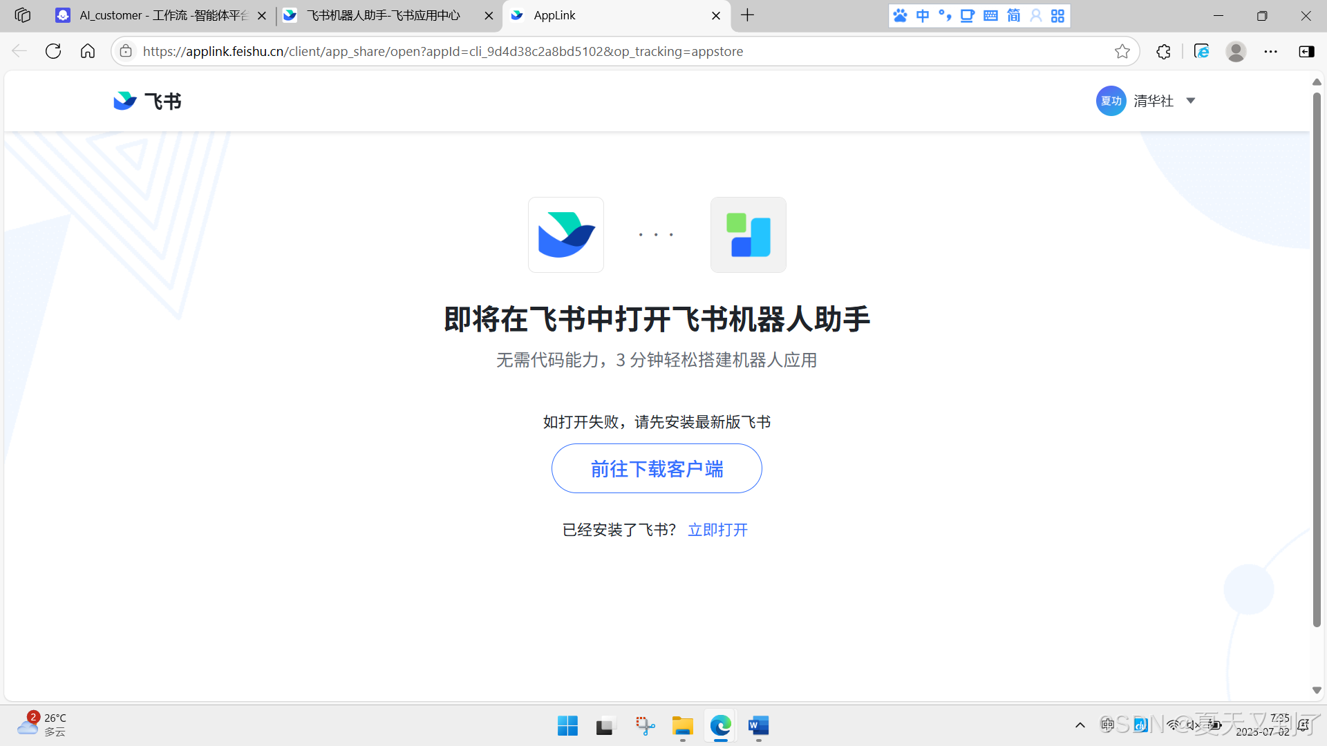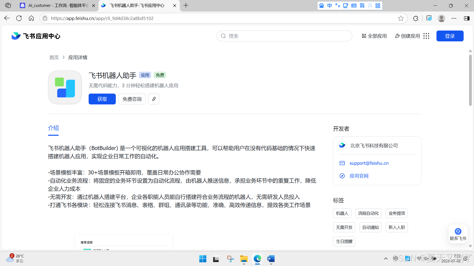 接下来需要设置飞书多维表格,飞书多维表格的作用是将客户问题和机器人的回答记录保存下来。登录飞书应用中心,网址为https://app.feishu.cn/app/cli_9d4d38c2a8bd5102,添加飞书机器人助手。