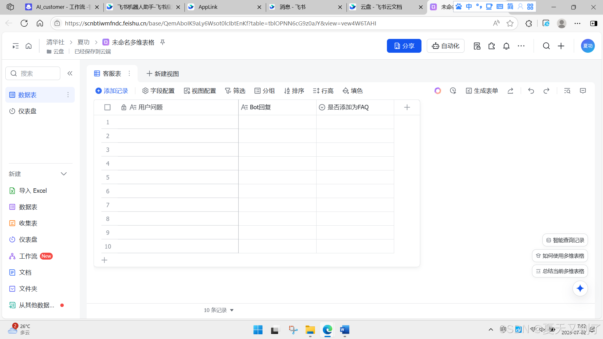 在多维表格中把新建的表格重命名为客服表,分别添加用户问题和Bot回复两个字段,字段类型为文本类型;再添加一个字段“是否添加为FAQ”,字段类型为单选类型,选项设置为是或否。这个客服表用来保存所有用户和智能客服机器人对话的记录。