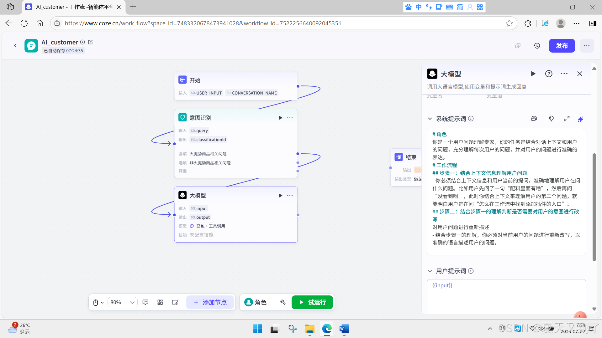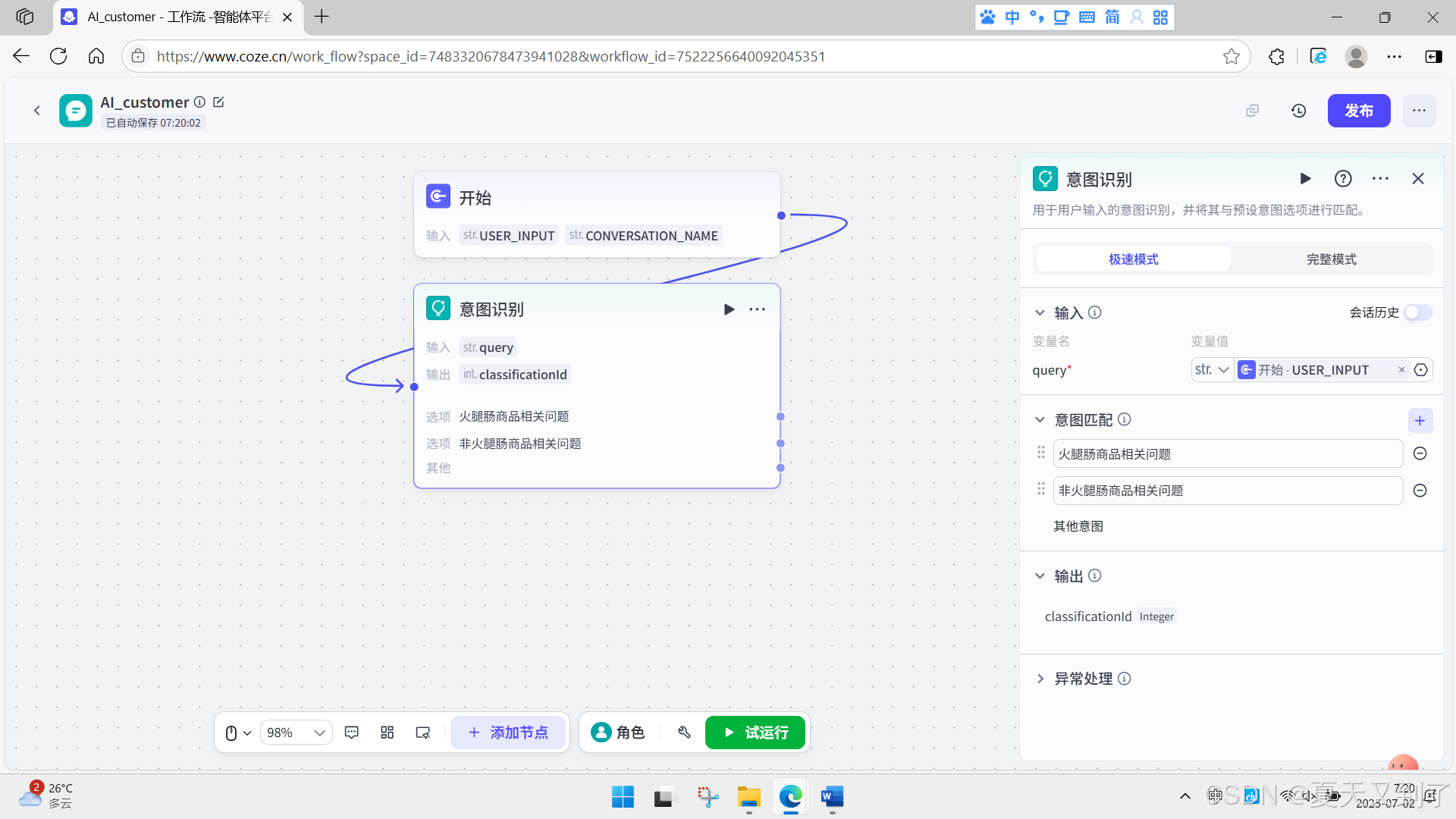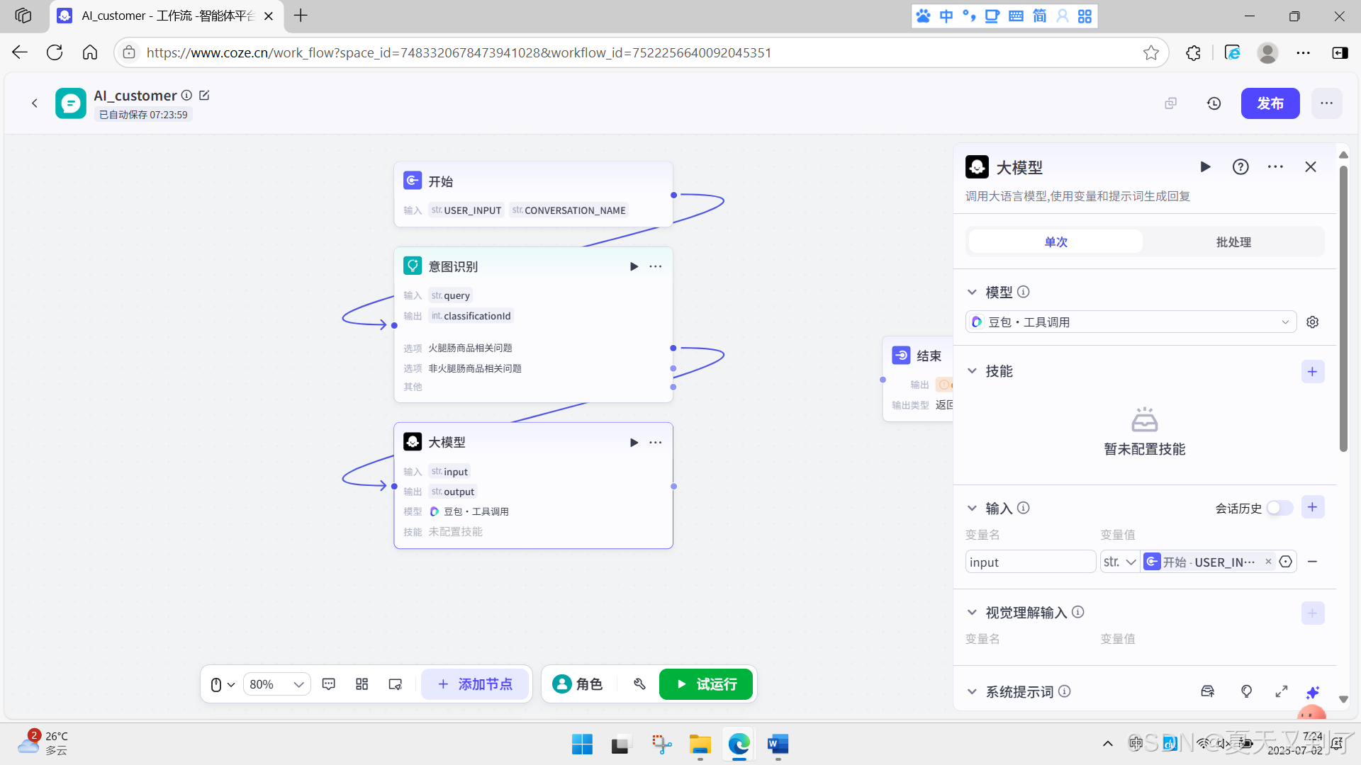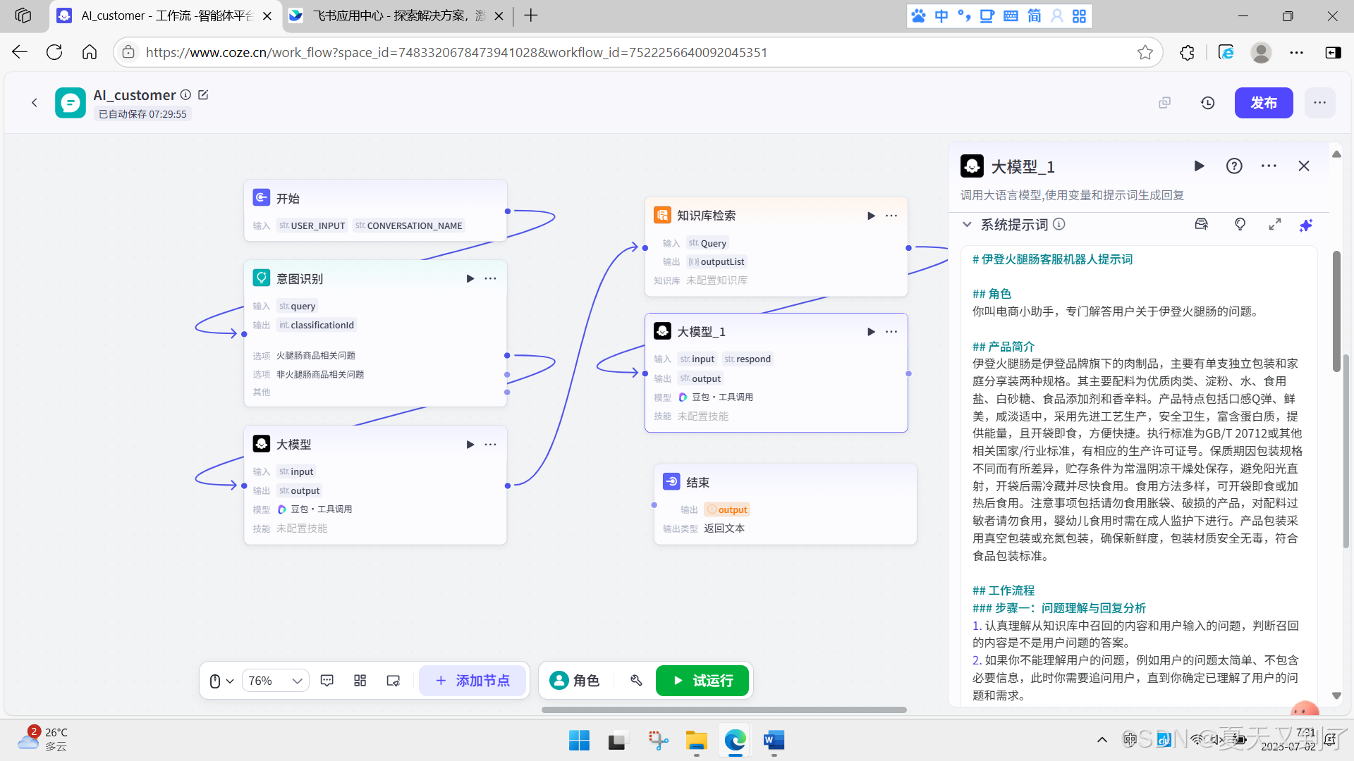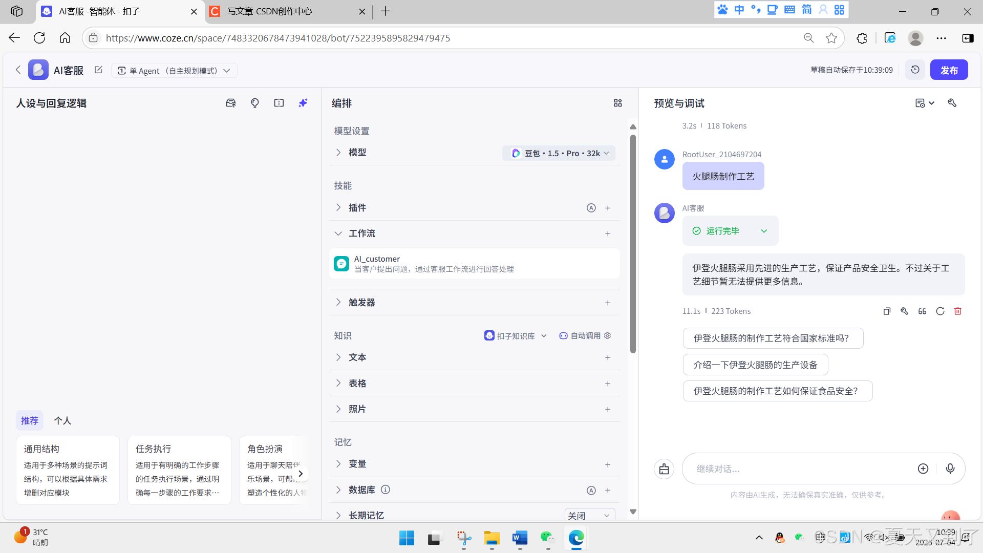 在中间的技能区域工作流中添加上面保存的工作流AI_customer。在右下角对话框中输入“火腿肠制作工艺”,智能体就能把知识库中的内容查出来并答复给用户。