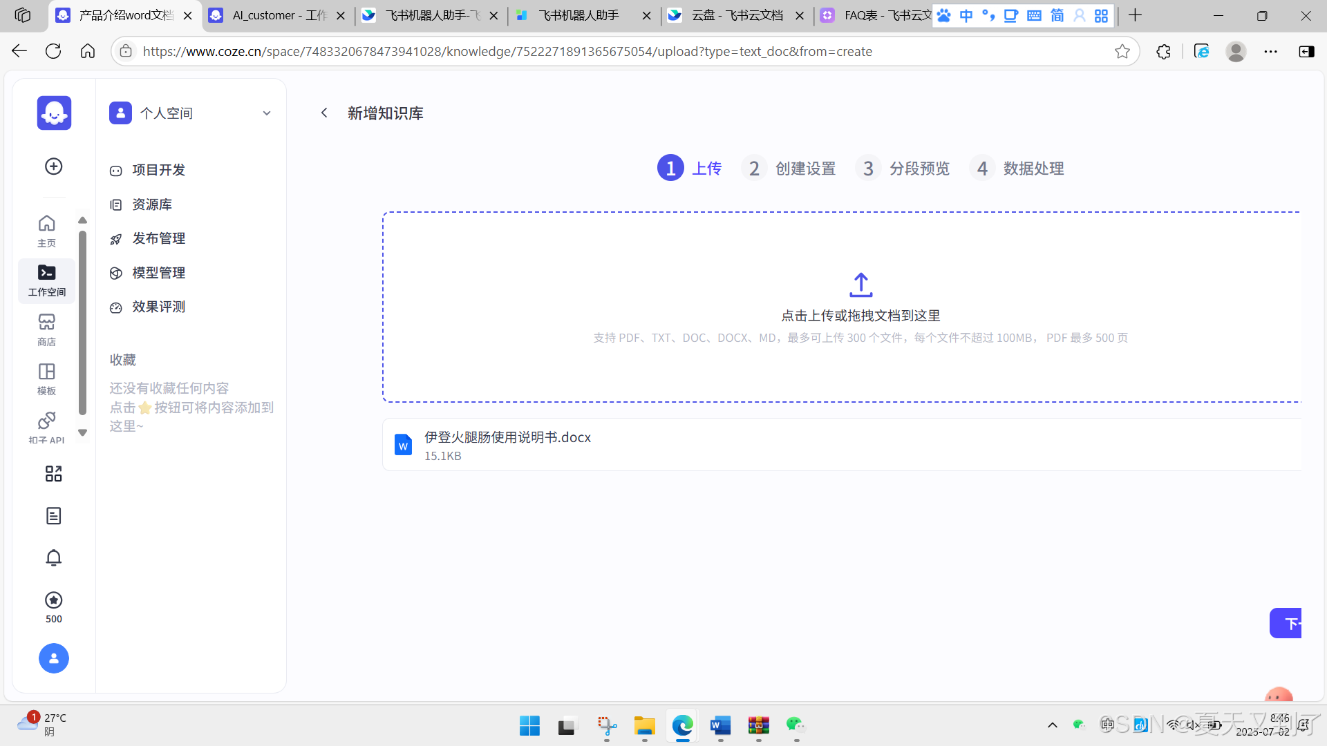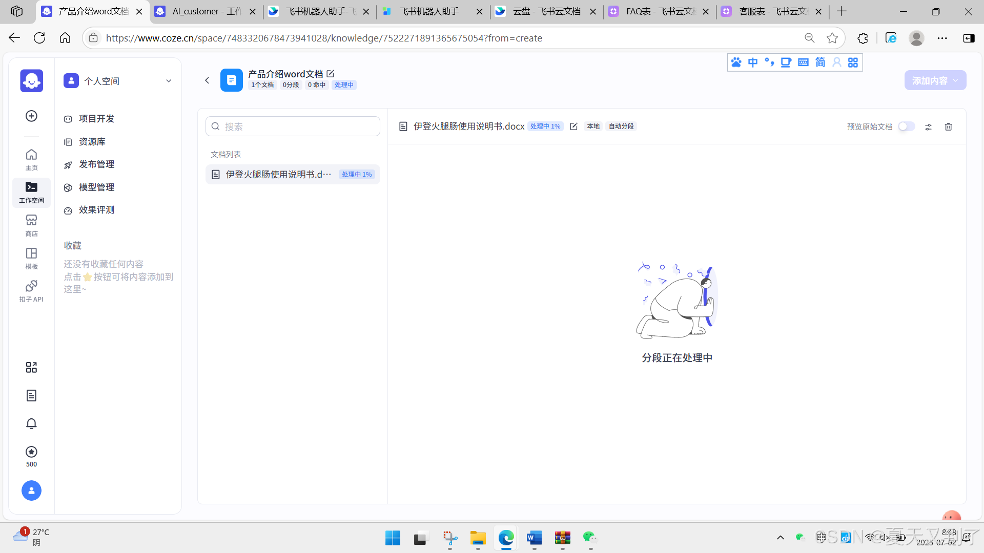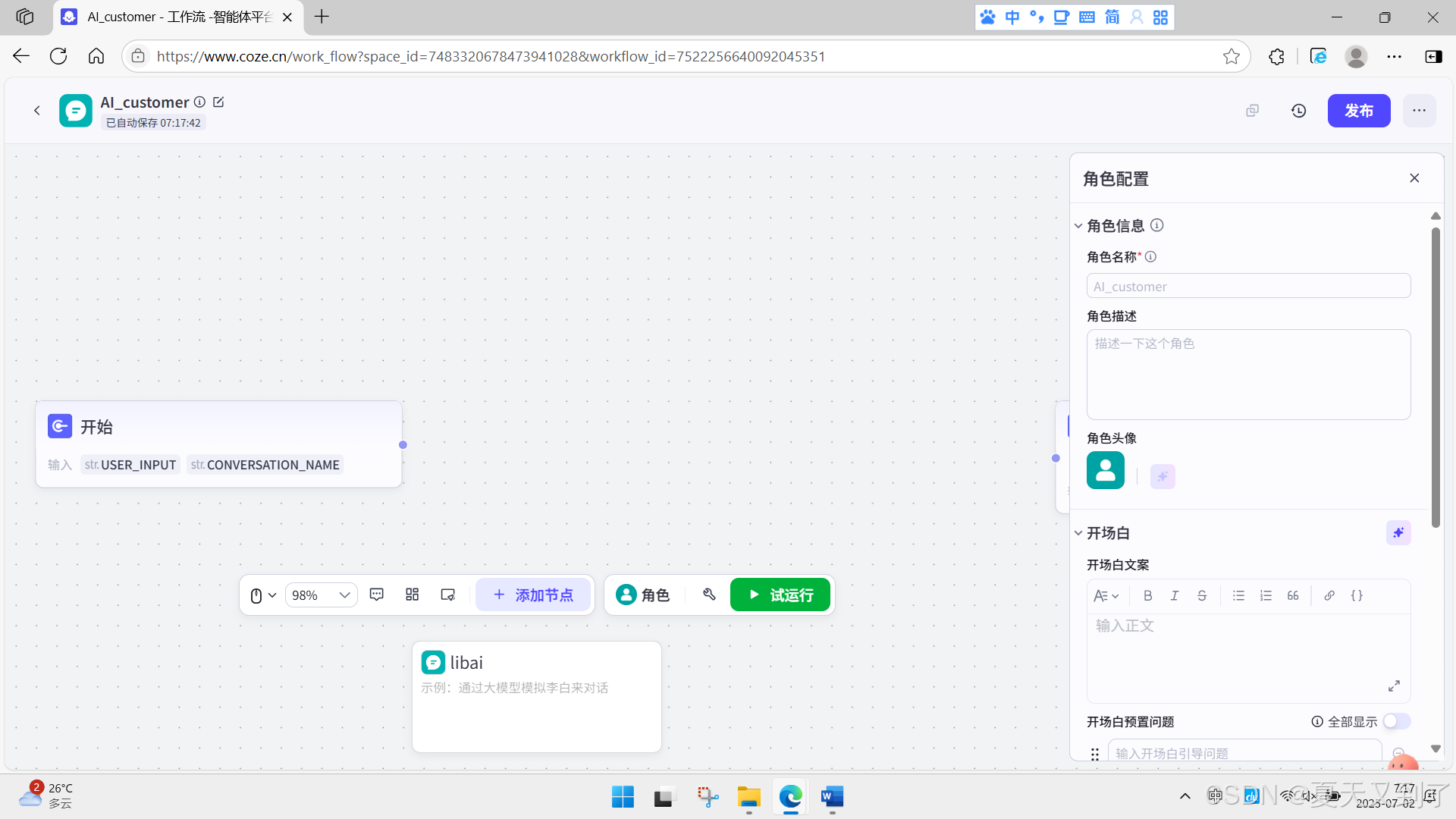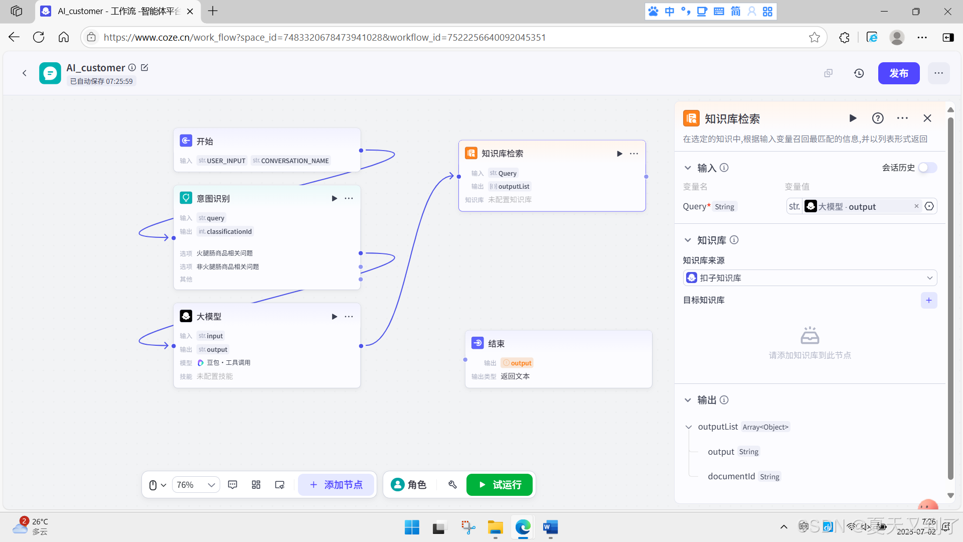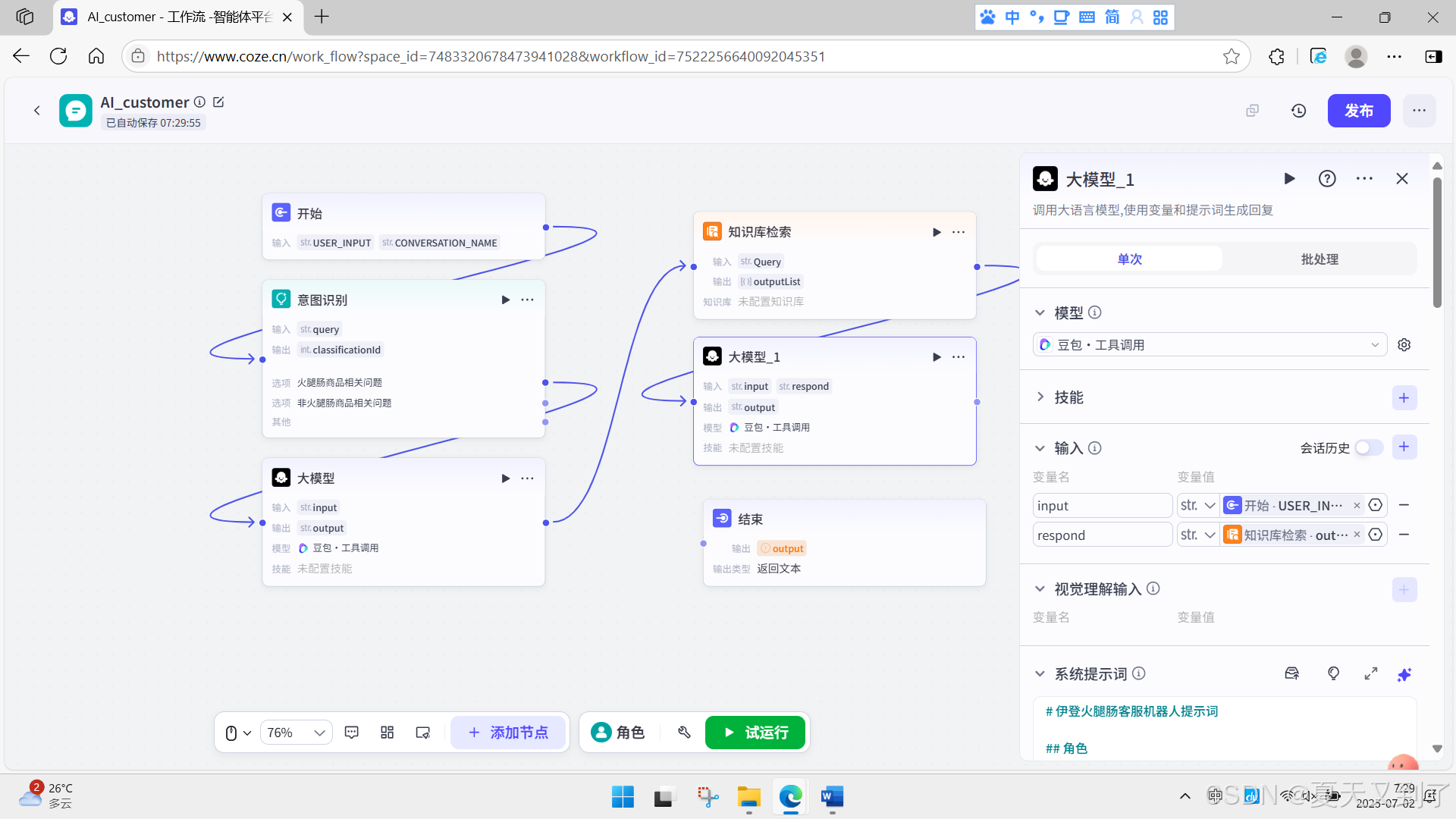 在中间的技能区域工作流中添加上面保存的工作流AI_customer。在右下角对话框中输入“火腿肠制作工艺”,智能体就能把知识库中的内容查出来并答复给用户。