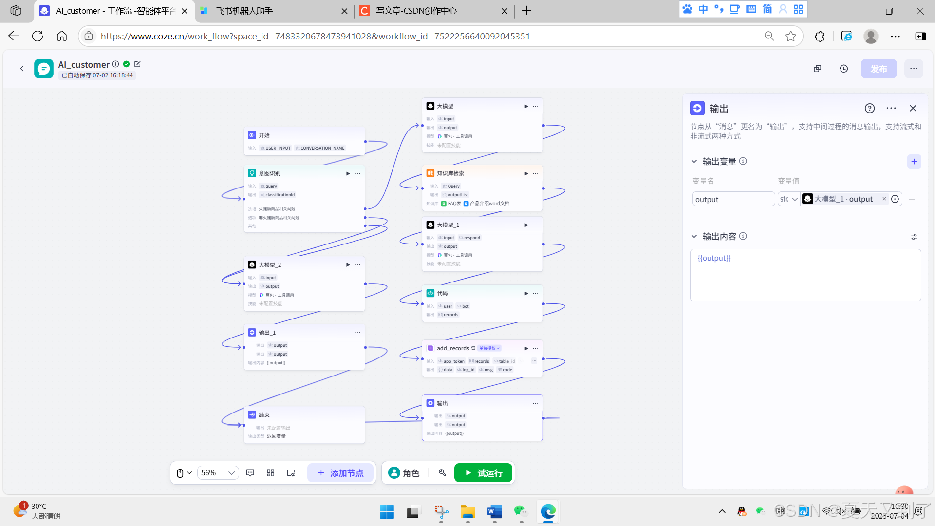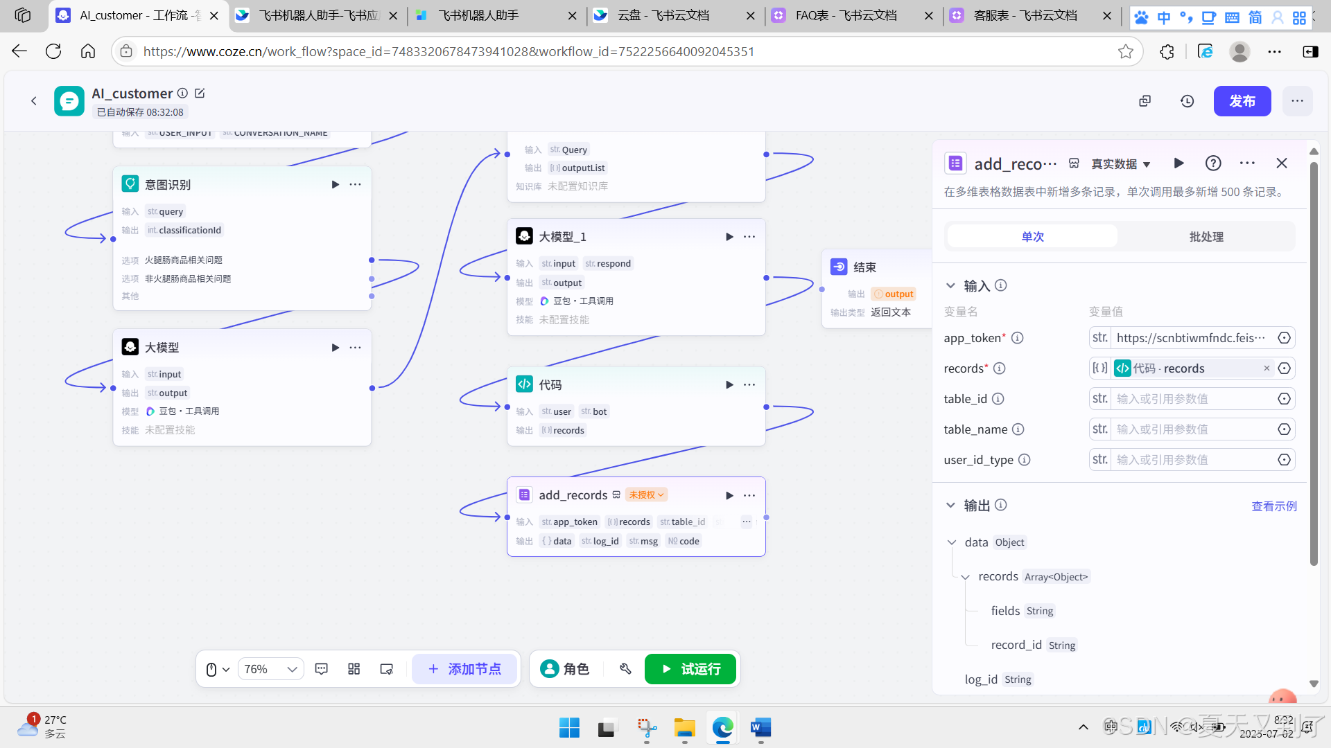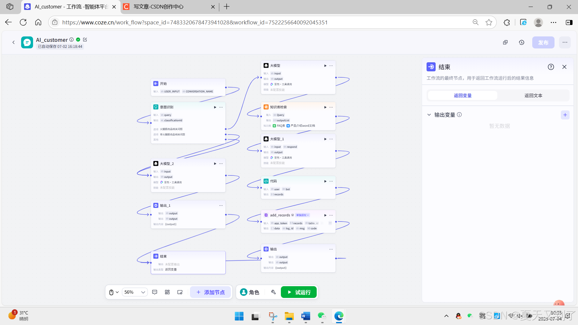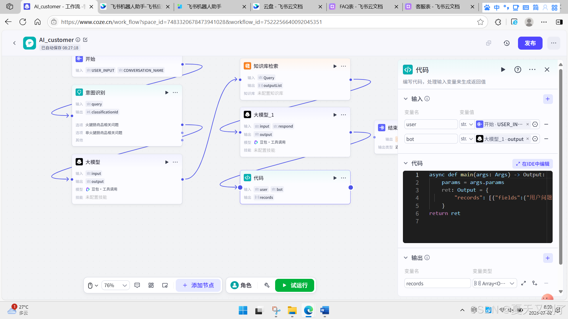 我们继续完善工作流,如下图所示。在工作流编辑页面添加代码节点,将客户问题和AI回复内容转换为后续飞书多维表格接受的数组格式。