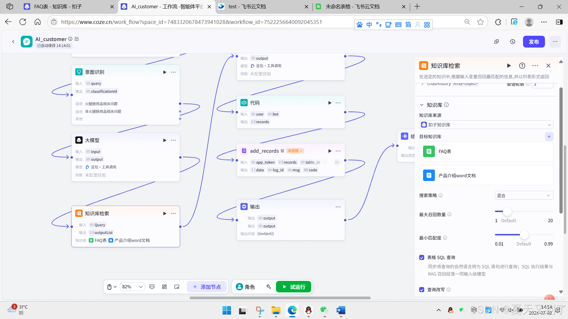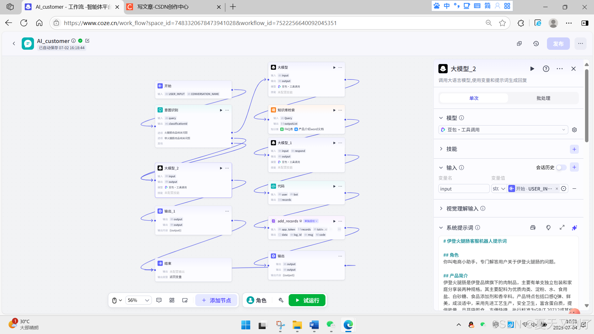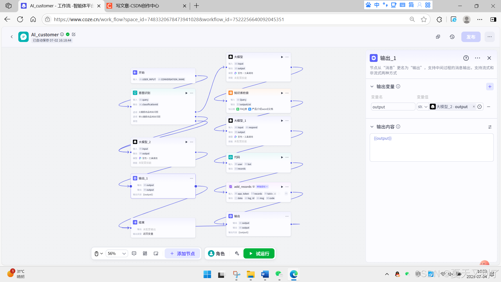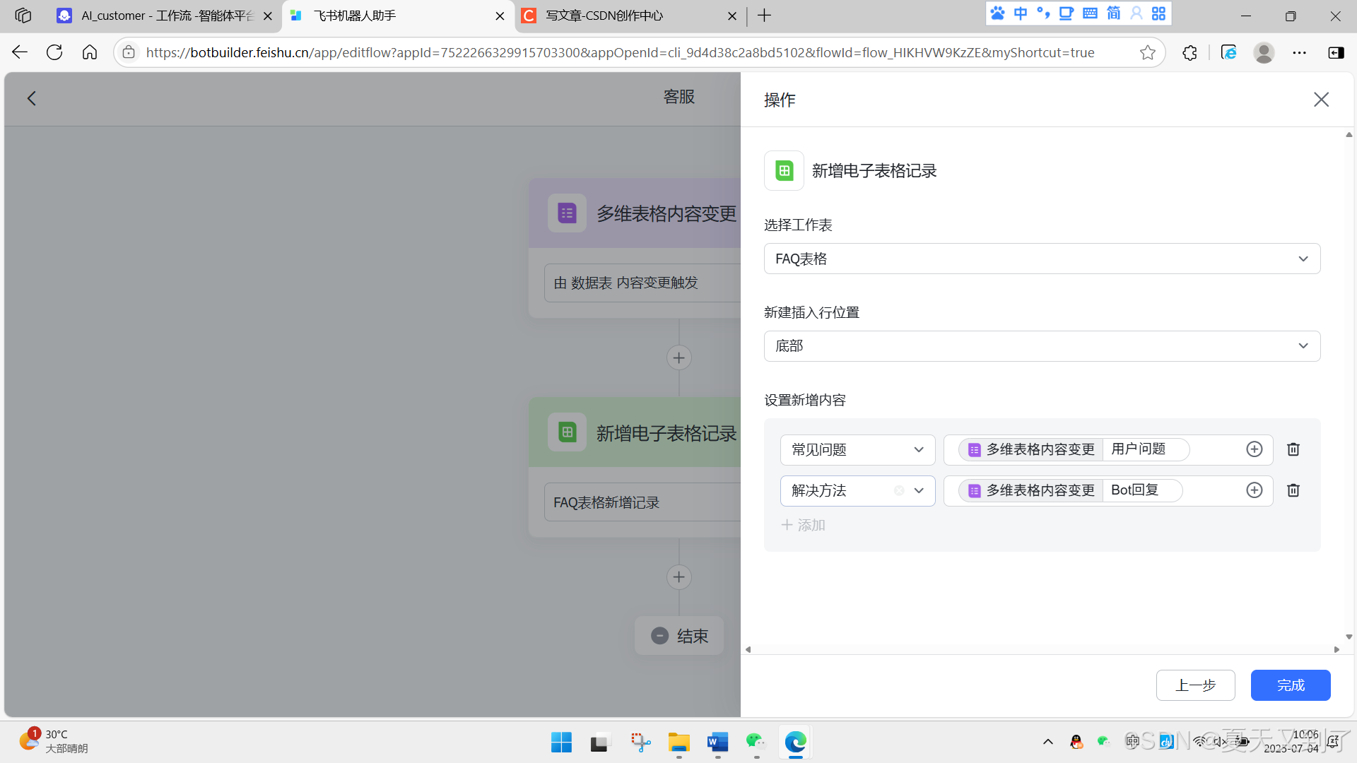 我们继续完善工作流,如下图所示。在工作流编辑页面添加代码节点,将客户问题和AI回复内容转换为后续飞书多维表格接受的数组格式。