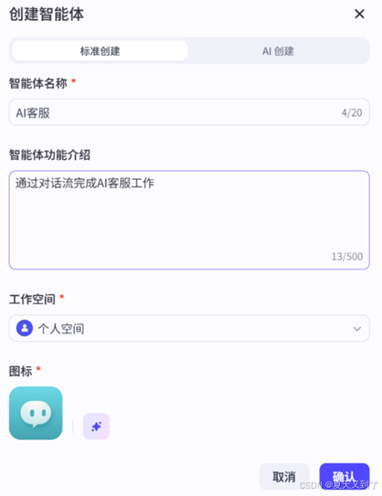 平台将打开“创建对话流对话框”,对话流命名为AI_customer,在描述栏中填写“当客户提出问题,通过客服工作流进行回答处理”。