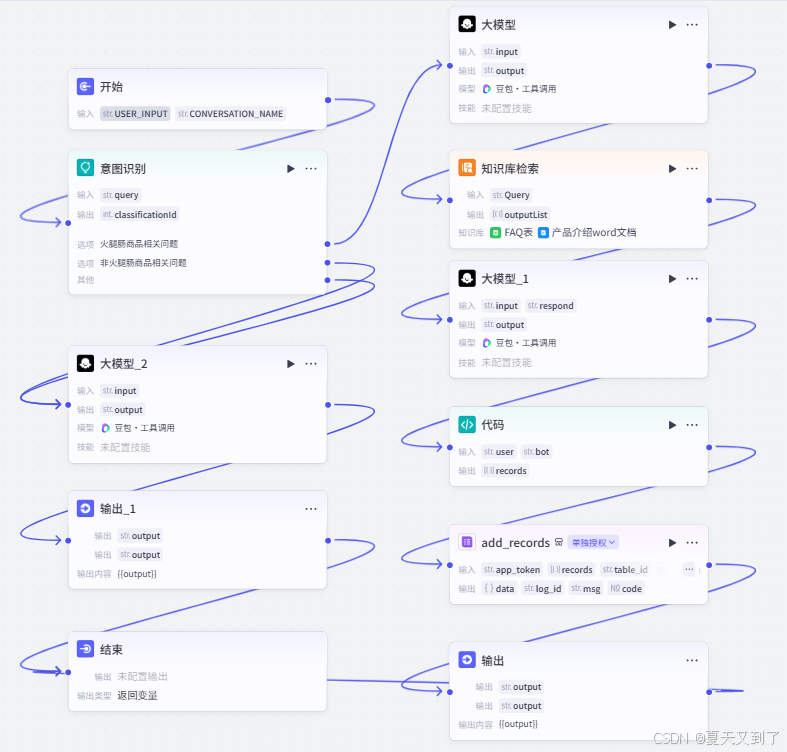 完成非产品问题的处理流程后,我们需要将两条回答路线的输出都接入结束节点,并且删除结束节点的输出变量。因为前面已经接入了输出节点,所以结束节点不需要输出内容。这一步至关重要,因为它确保了无论用户的问题被分类为哪一类型,都能在得到回答后正确结束对话流程,为下一轮对话做好准备。