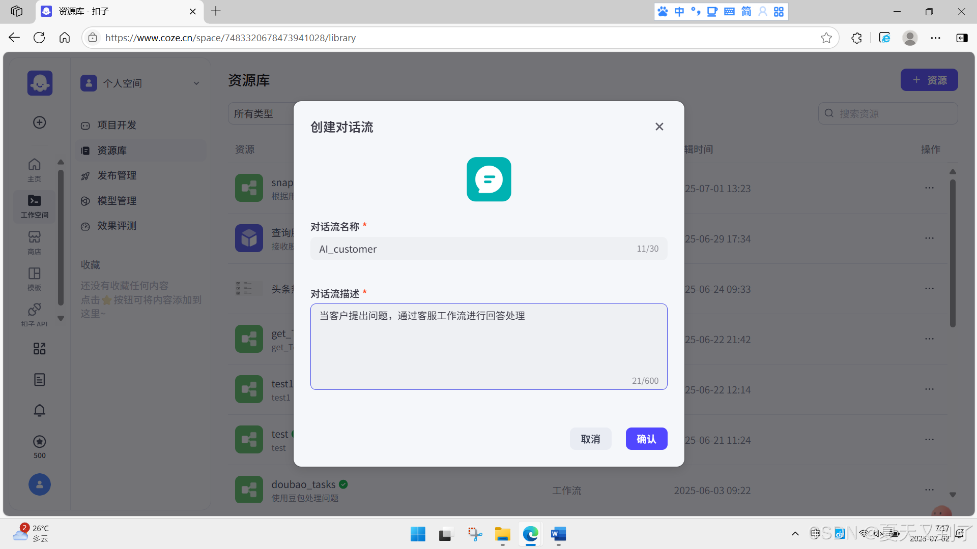 首先,登录扣子官方网站,依次点击工作空间>“+ 资源”按钮,在打开的菜单中点击“对话流”。