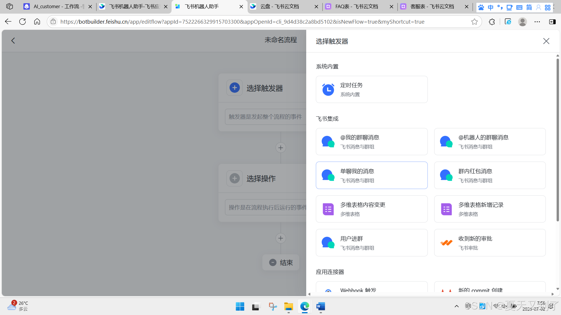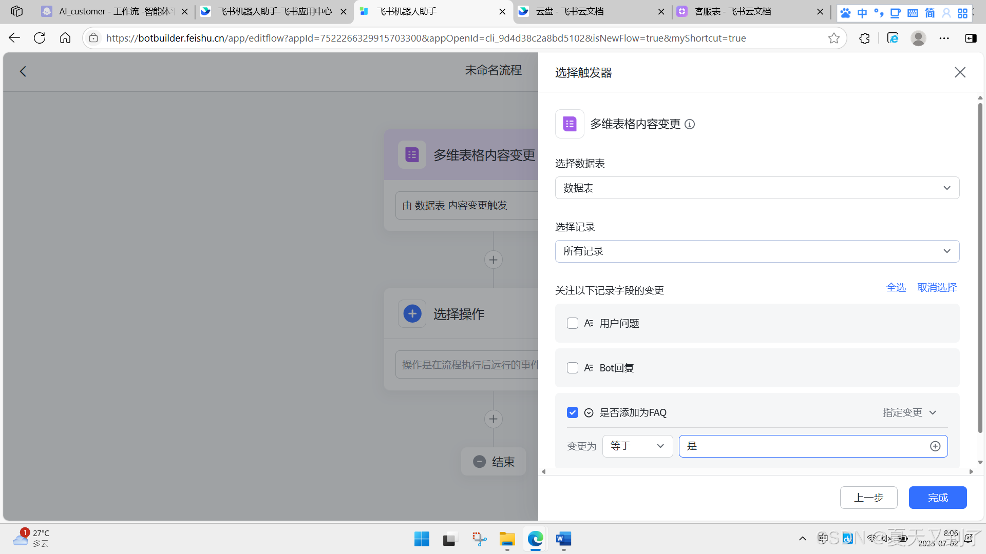 完成上面两个表格的设置后,还需要设置机器人指令,完成动作绑定,帮助我们提取想要的标准案例,即客服表经典案例自动存入FAQ表。我们到https://botbuilder.feishu.cn/home设置机器人指令,首先单击页面上的“新建指令”,在打开的流程页面中,单击“选择触发器”,按照如图13-19所示进行配置,首先触发器选择“多维表格内容变更”,选择数据表为“数据表”;是否添加为FAQ的后面,选择“指定变更”,选择该字段变更为“等于”“是”的情况,最后单击“完成”按钮,完成触发器的选择。