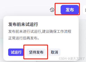 完成对话流后,可以单击工作流编辑页面右上角的“发布”按钮,再单击“坚持发布”按钮。系统会自动检查整个工作流是否存在逻辑或连接错误,确保工作流发布后能够正常运行。如果存在问题,系统会给出提示,要求修复后再次尝试发布。