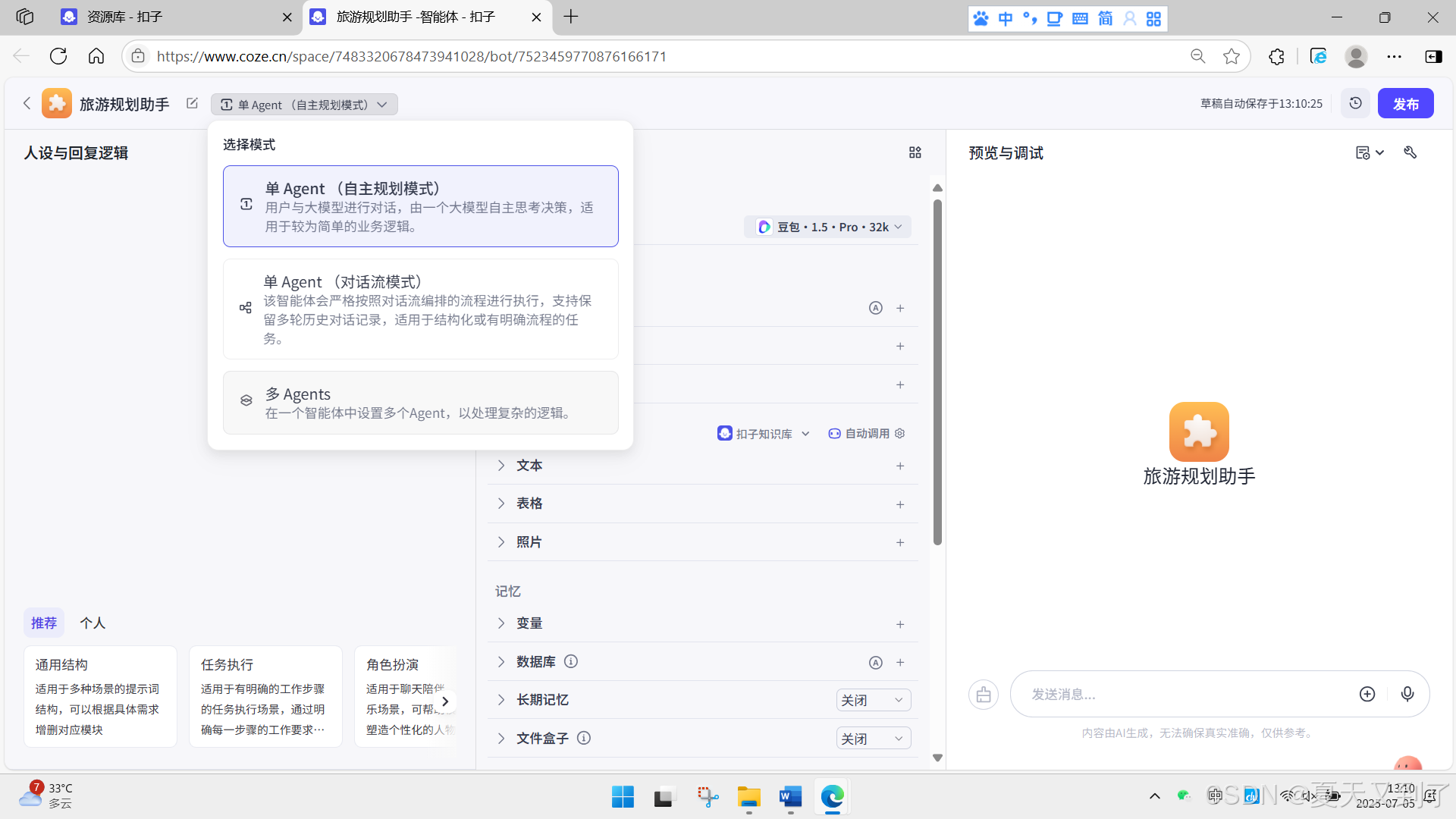 旅游路线规划Agent负责设计详细的旅游路线,包括游客每日的行程安排和交通方式。适用场景填写“负责设计详细的旅游路线,包括每日的行程安排和交通方式。”,再填写一下Agent提示词,其他默认的配置则保持不变。