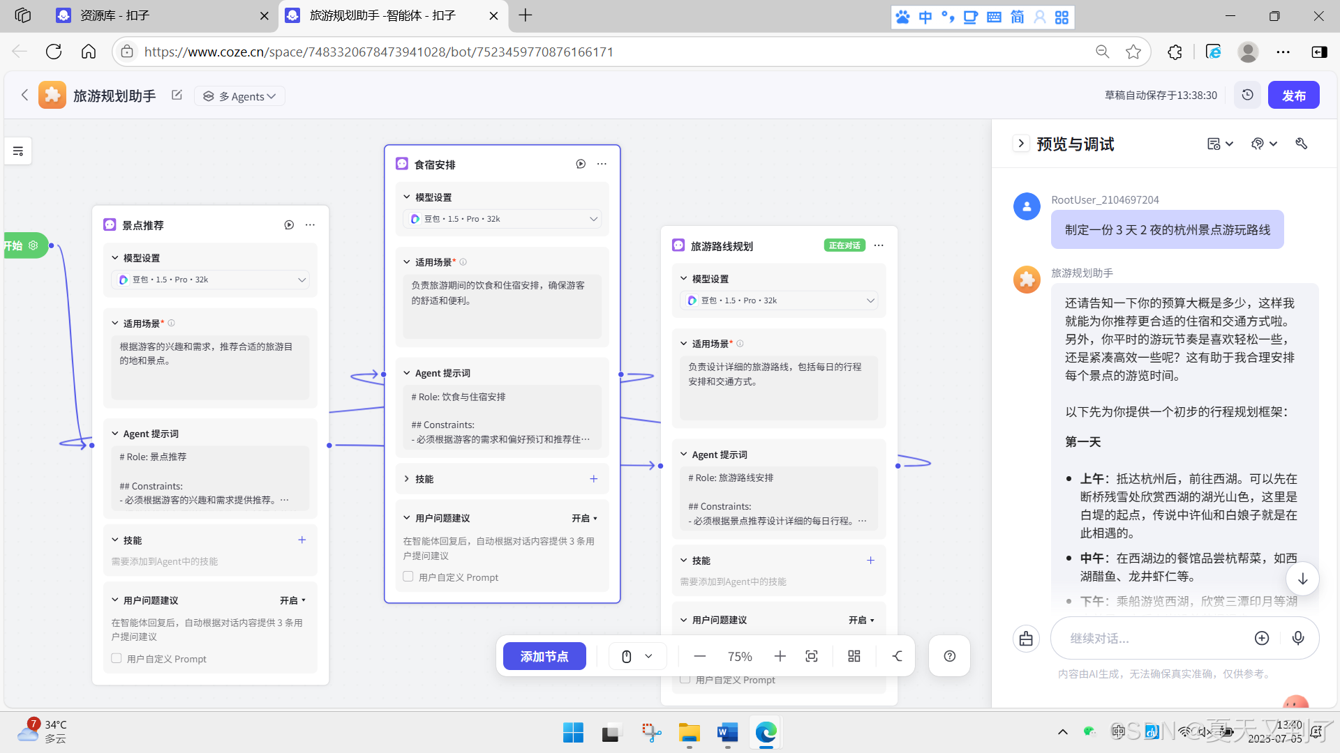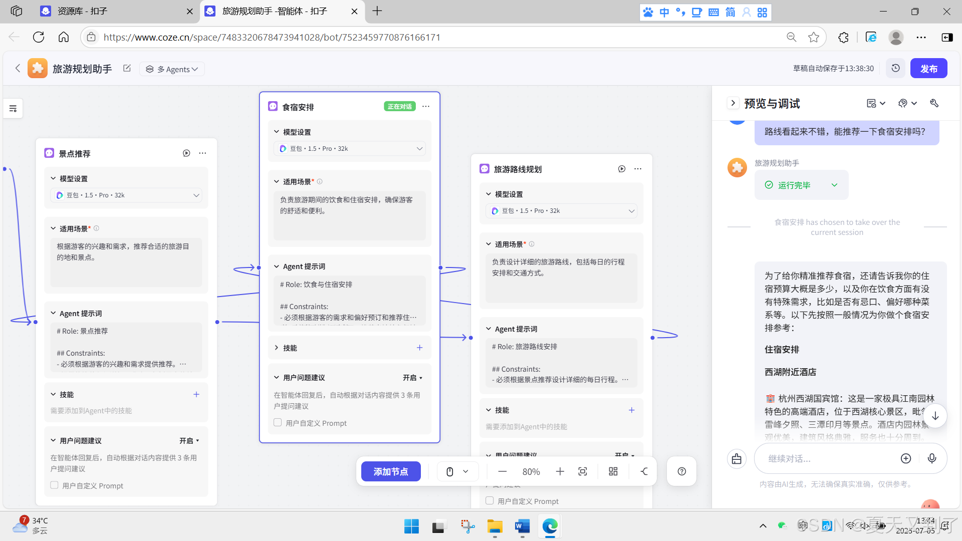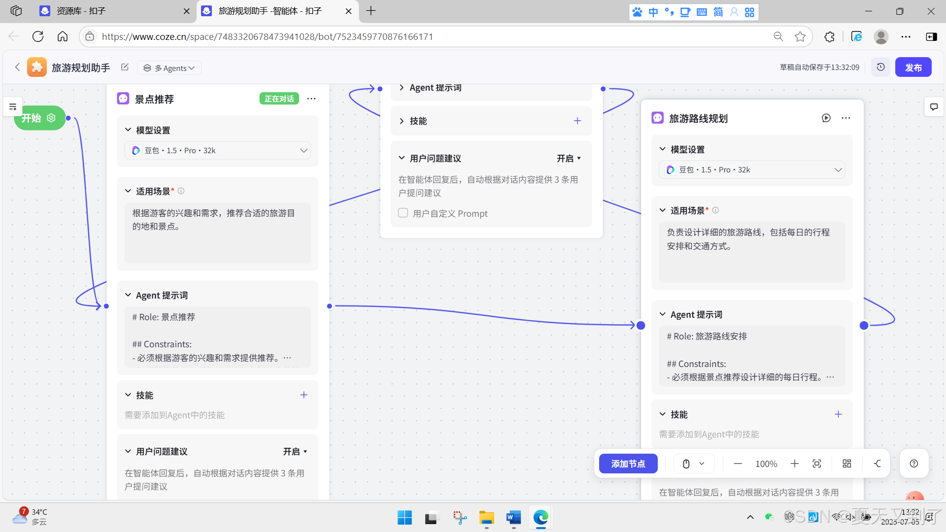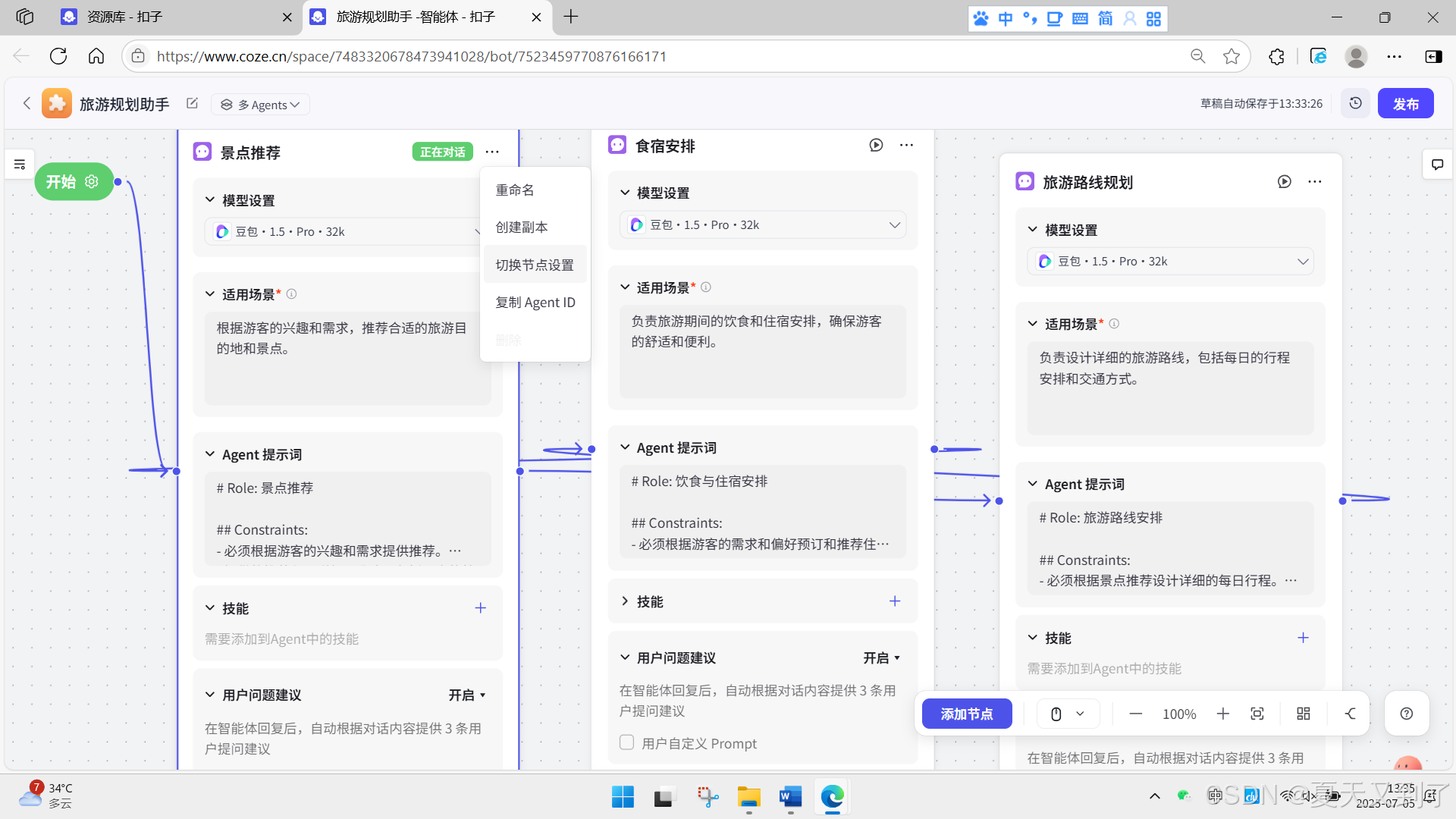 在智能体编排页面原来一个Agent的基础上再添加两个Agent,分别将3个Agent命名为“景点推荐”“食宿安排”“旅游路线规划”,并且相互连线。