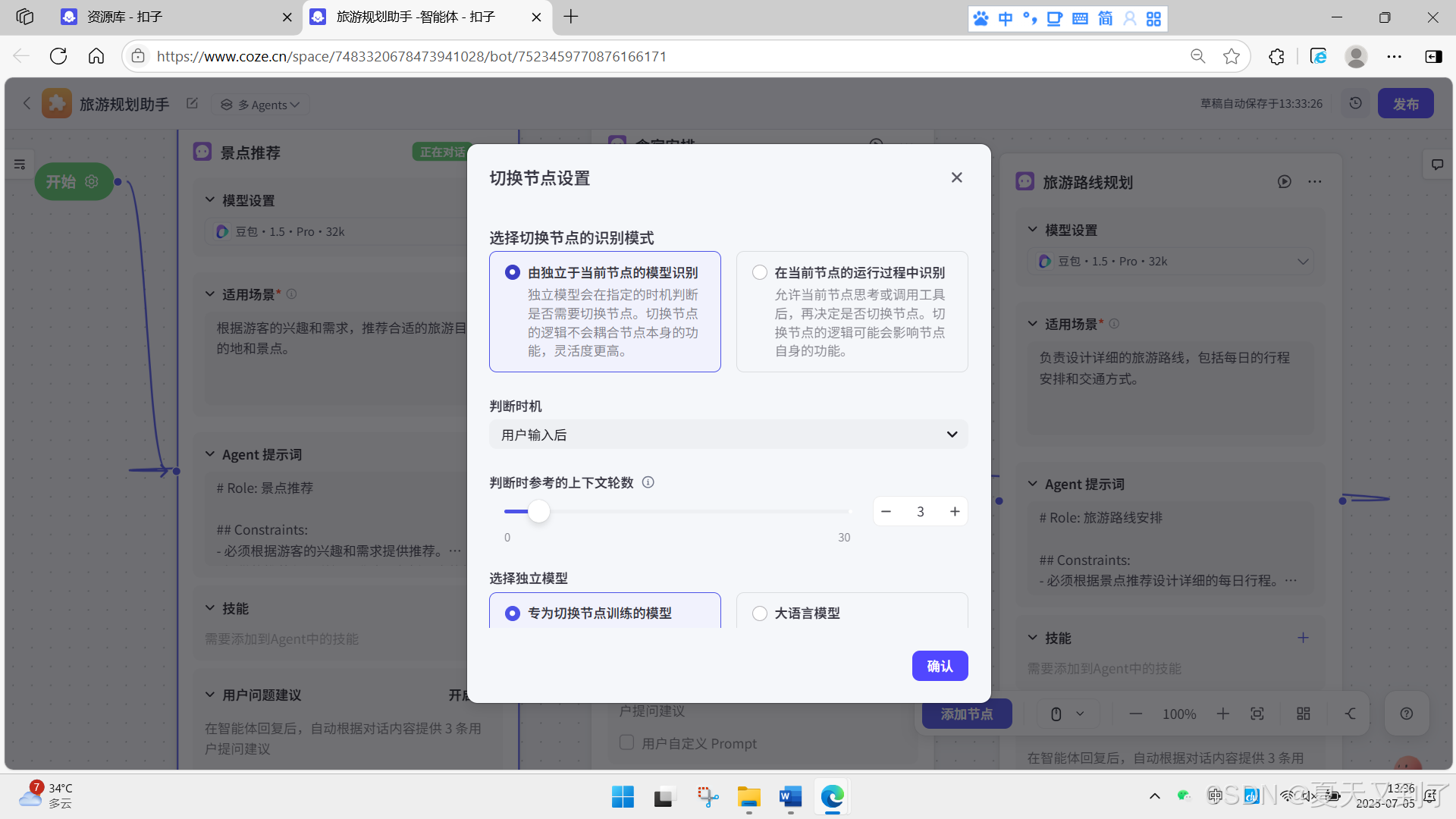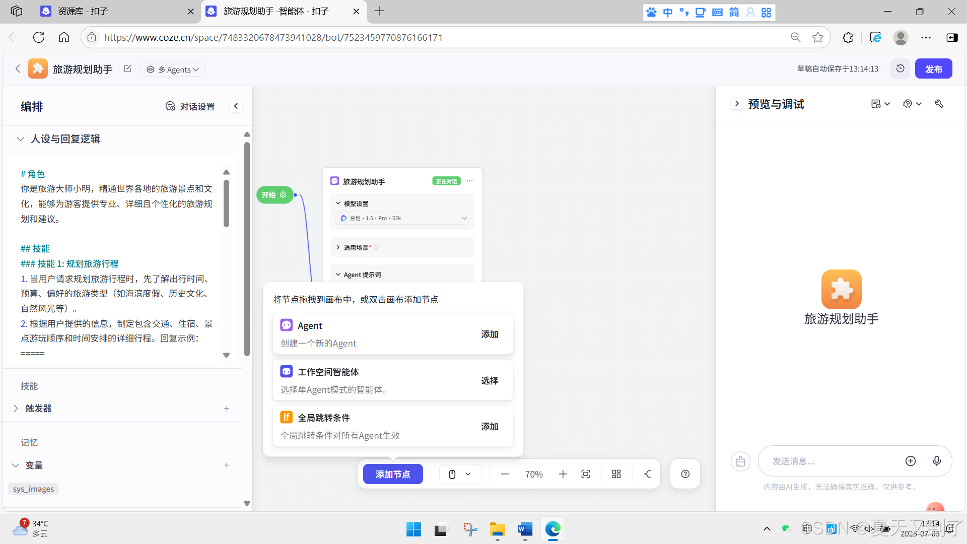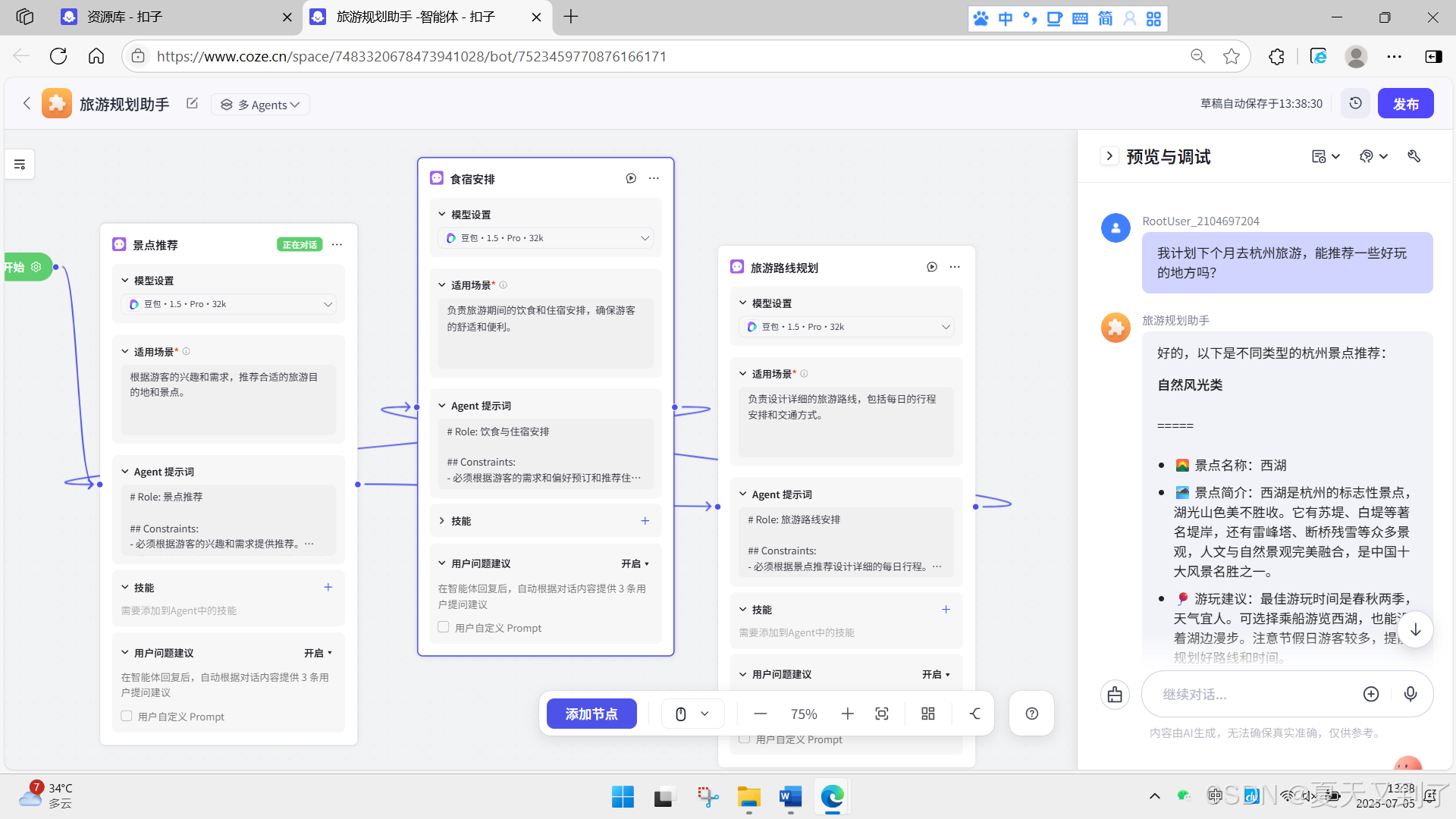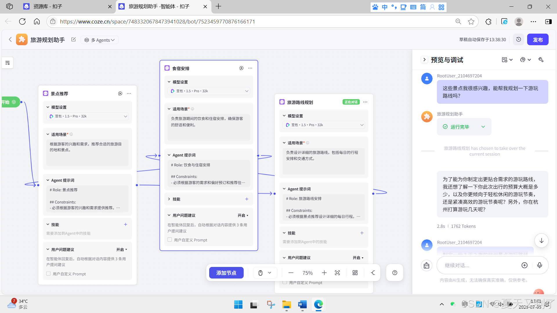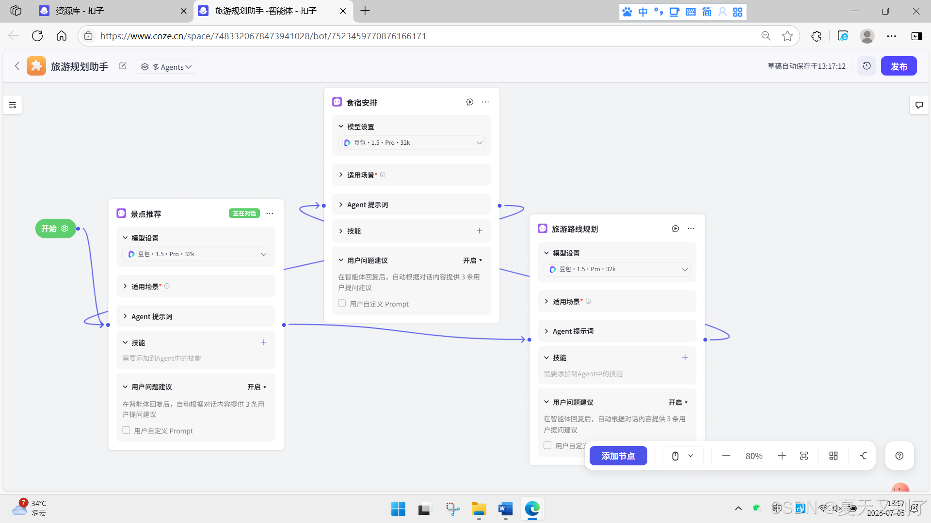 在智能体编排页面原来一个Agent的基础上再添加两个Agent,分别将3个Agent命名为“景点推荐”“食宿安排”“旅游路线规划”,并且相互连线。
