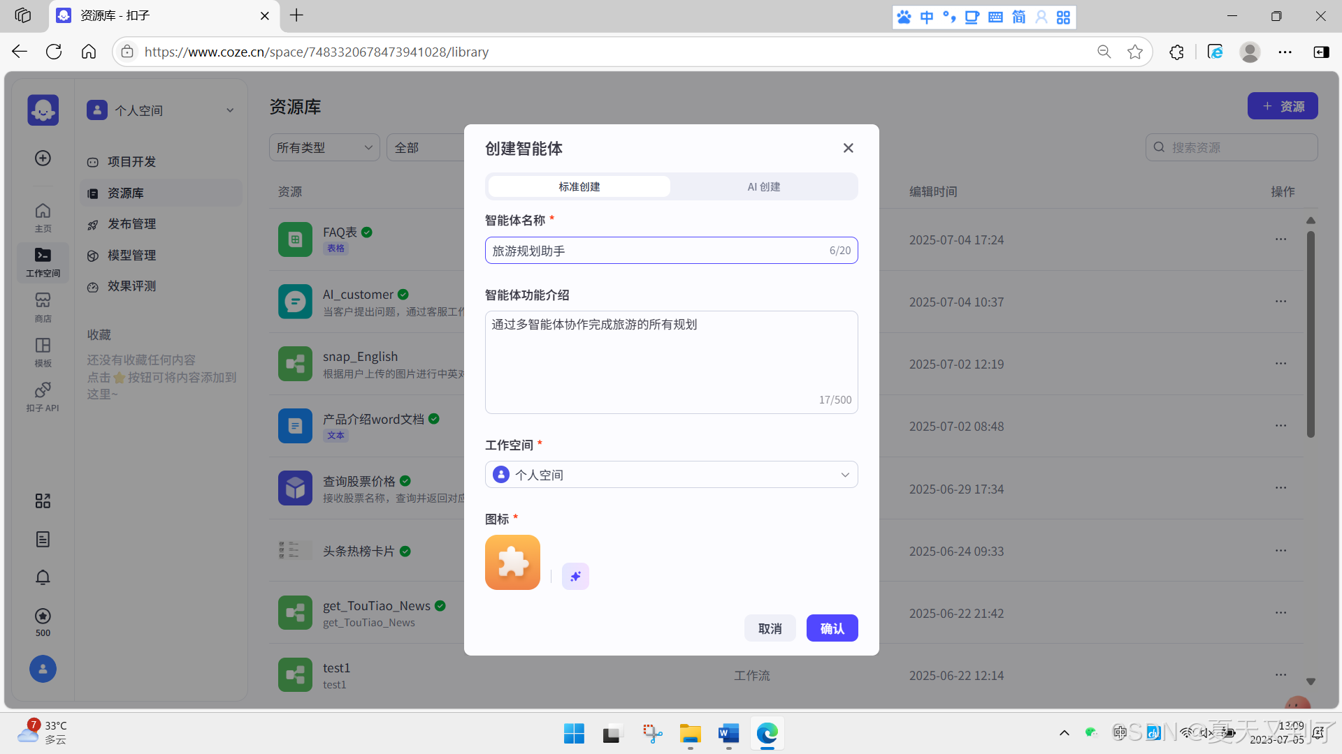 首先创建智能体。在打开的“创建智能体”窗口中配置智能体的基础信息,智能体名称填写“旅游规划助手”,智能体功能介绍填写“通过多智能体协作完成旅游的所有规划”。