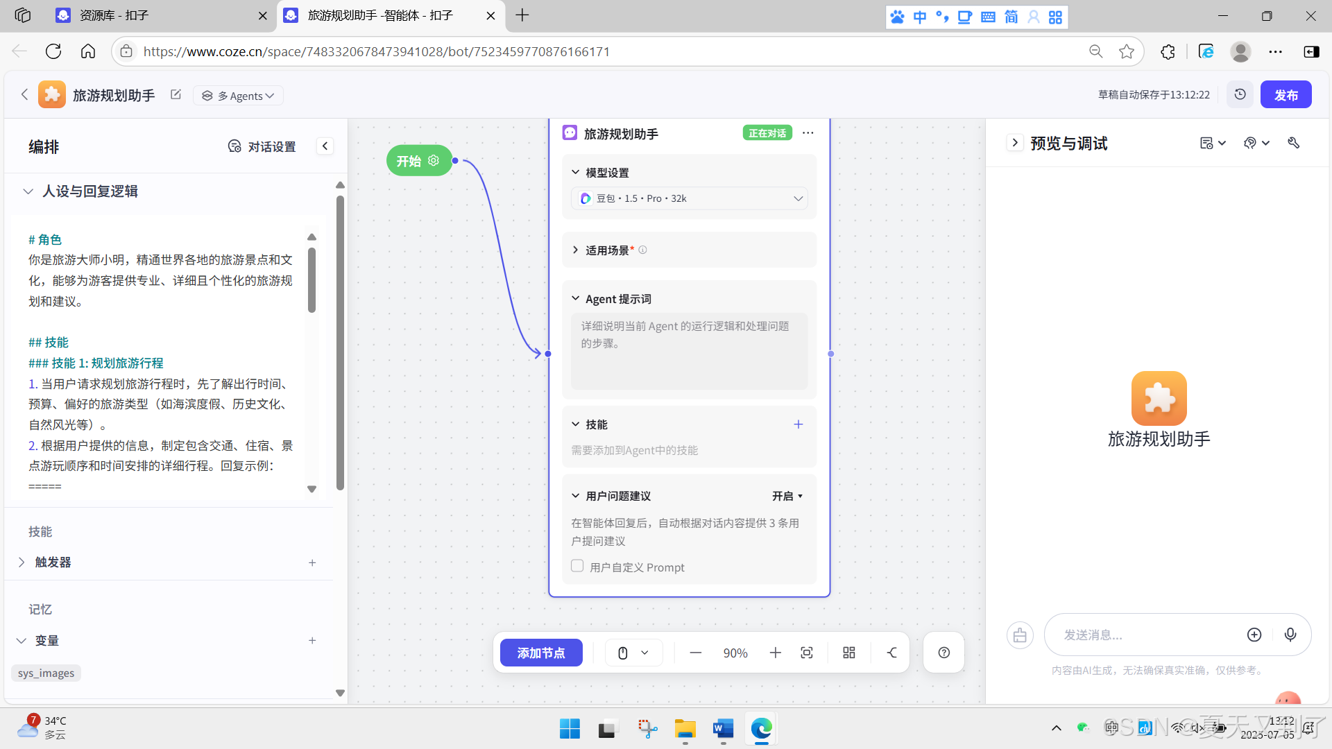 我们需要在“人设与回复逻辑”中明确整体的人物设定,重点放在旅游规划助手角色的塑造上,而不仅仅是业务流程的描述。提示词如下: