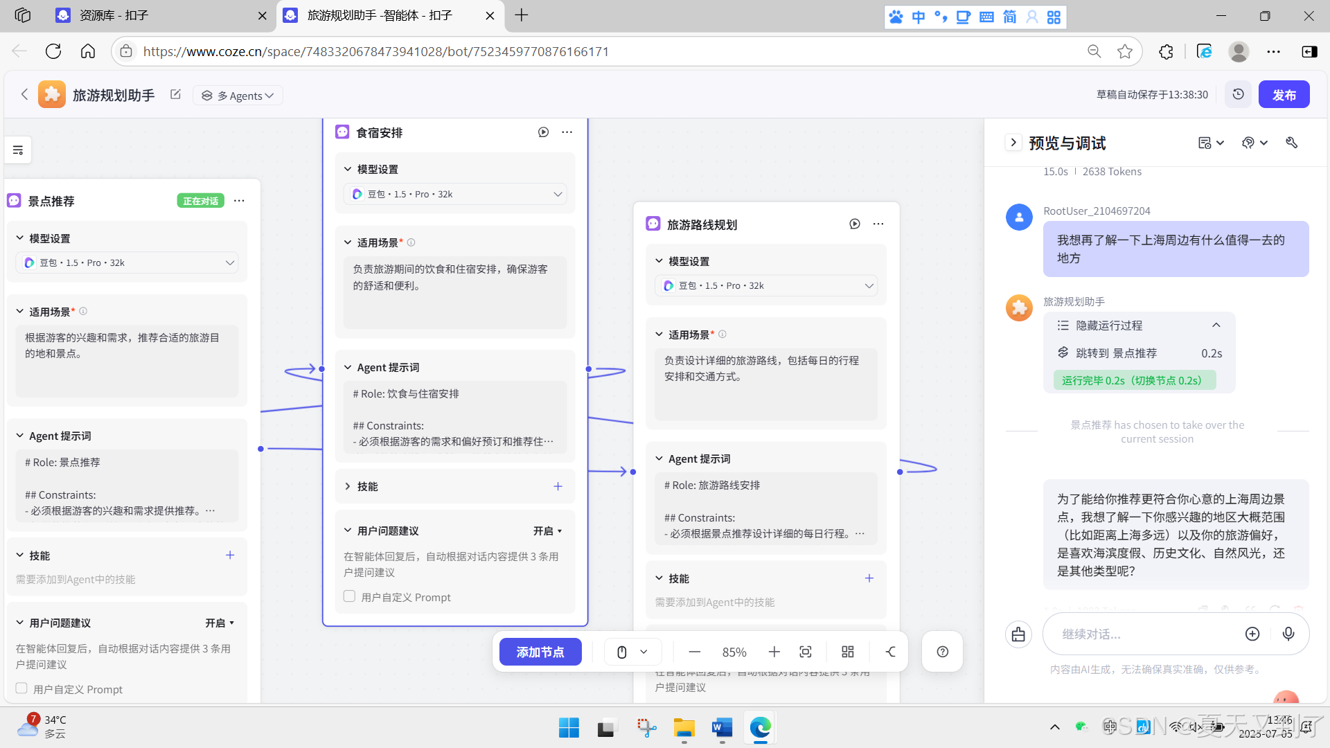 当我们回答“这些景点我很感兴趣,能帮我规划一下游玩路线吗?”,表示对推荐的景点满意后,系统自然引导我们进入旅游路线规划Agent。