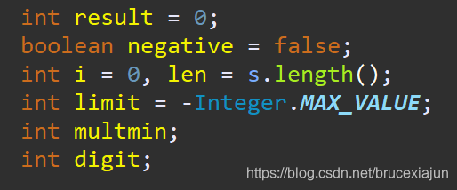 564-574:如果第一个字符小于'0'(可能是'-'或者'+'符号),则判断第一个字符是不是'-'符号,是的话negative置于false,表示这是一个负数。同时limit重新赋值为最小的整数。如果第一个字符不是'-'也不是'+',抛出异常。如果整个字符串长度是1,抛出异常。i前进1位(据此推测i表示当前遍历到的字符的索引)