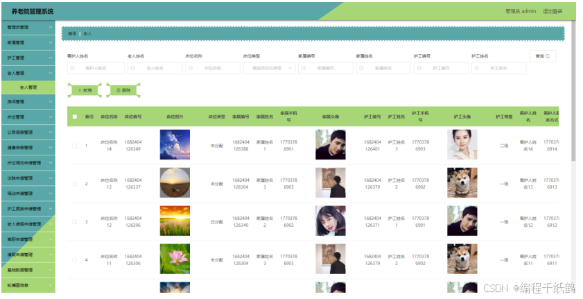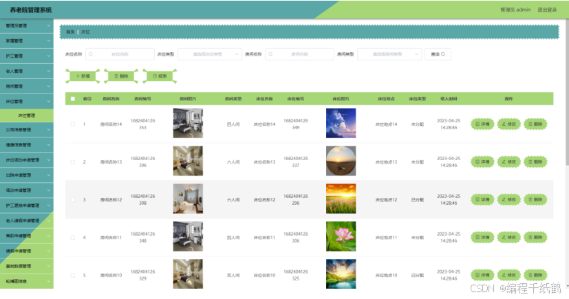 养老院管理系统、整体采用Java作为后台主要技术语言,利用MySQL数据库建立数据分析表来储存系统软件造成的信息。后台主要框架采用SpringBoot框架进行整体框架和布局。这个的话系统能够提供信息表明以及相应的服务项目,系统实现了包括床位管理、床位调动申请管理、出院申请管理、调动申请管理、字典管理、房间管理、公告信息管理、床位更换申请管理、家属管理、健康信息管理、老人管理、老人请假申请管理、离职申请管理、请假申请管理、床位管理、管理员管理。用户的功能等。总而言之,养老院管理系统集中化管理信息,具备安全性强、工作效率高、内存空间大、成本费用低等特点。能降低信息管理成本费,完成信息管理。