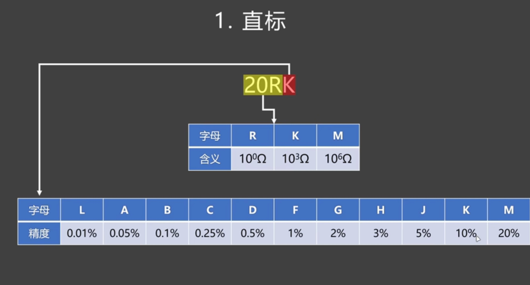 由两位数字加一位字母组成,前两位数字标识阻值,需查表获得;最后一位字母表示倍数关系,也需查表获得。