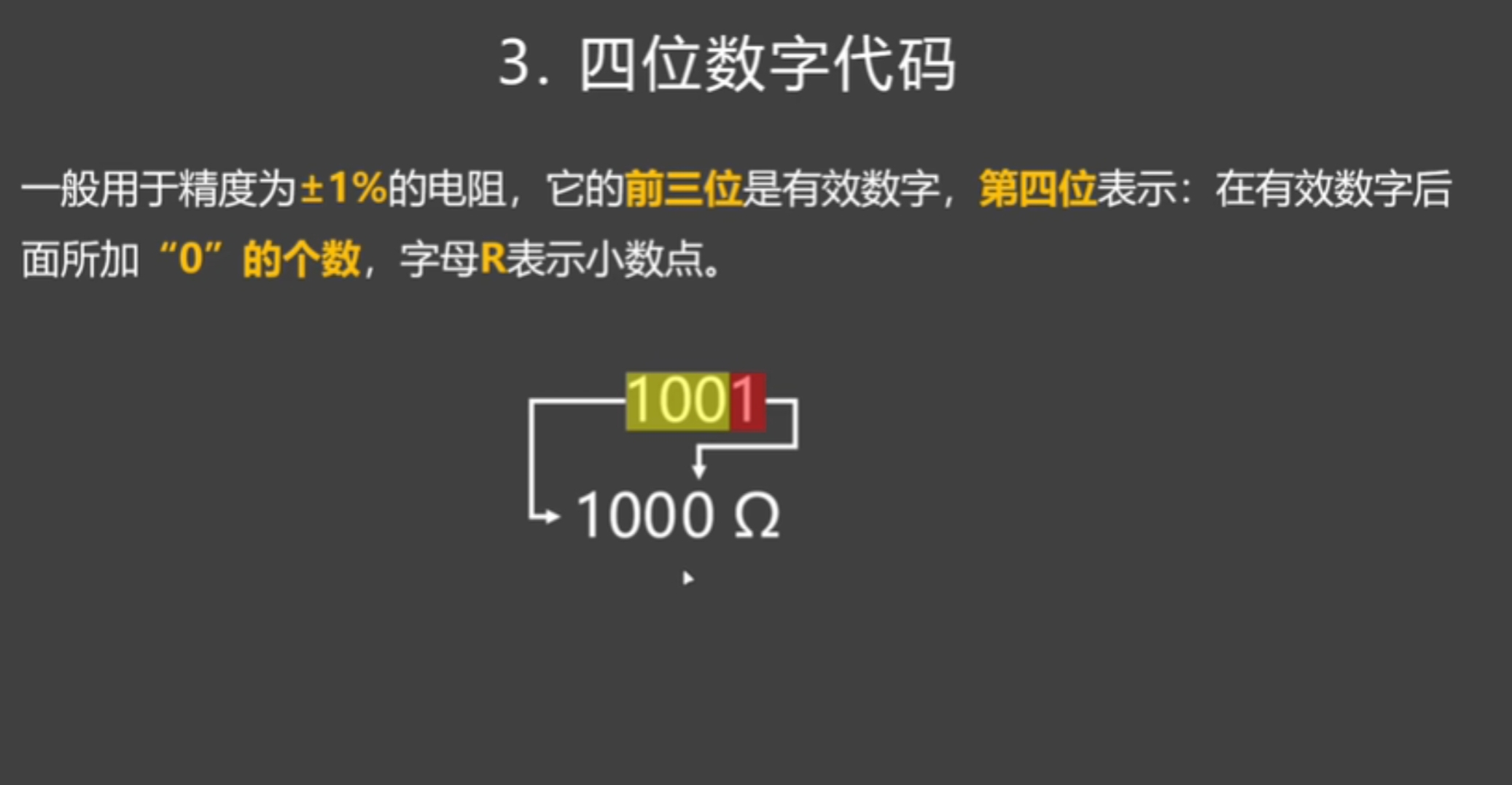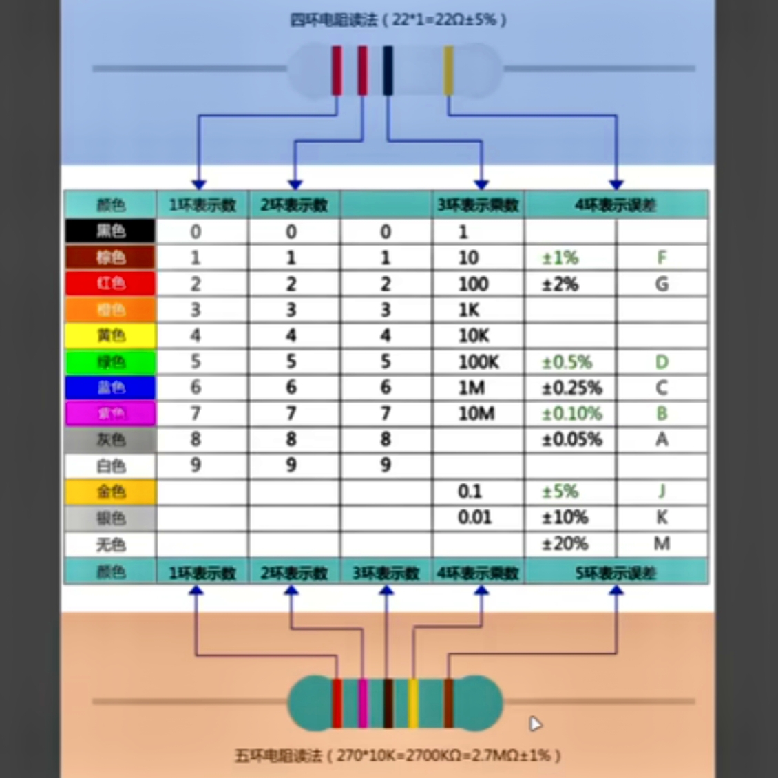 四环电阻:前两环为有效数字,第三环为倍率,第四环为误差。