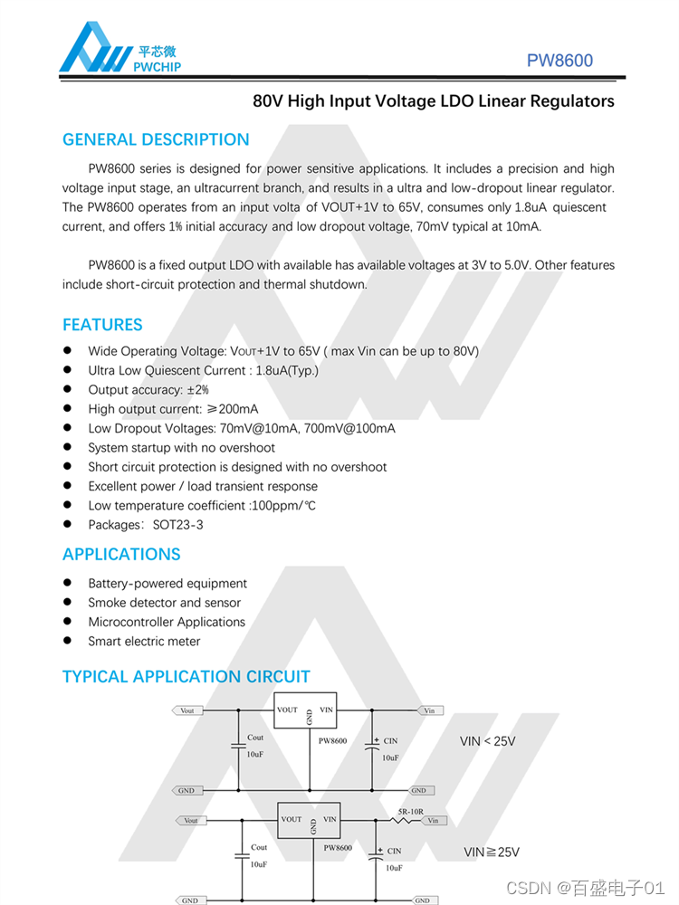 这篇文章介绍了平芯微的PW8600系列高输入电压LDO线性稳压器,特别适合功率敏感应用,具有高压输入、低差压、低静态电流和多种保护功能,如短路保护和热关断,适用于电池供电设备、烟雾探测器和智能电表等。