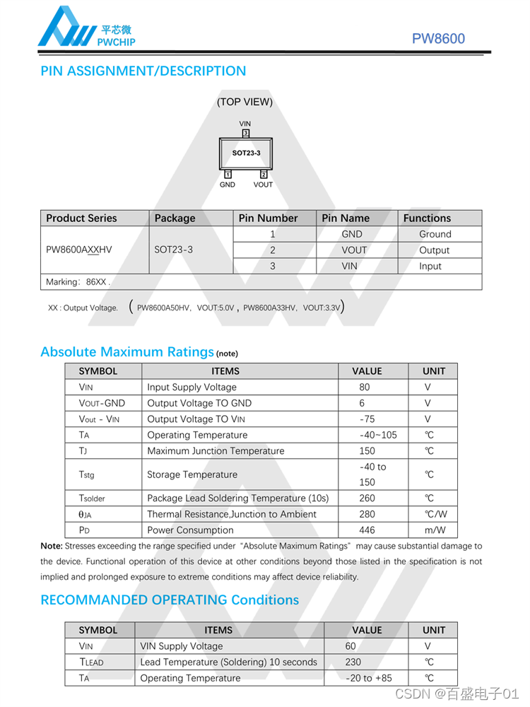 PW8600A33 A50 HV SOT23-3封装 80V输入 0.2A LDO线性稳压器芯片