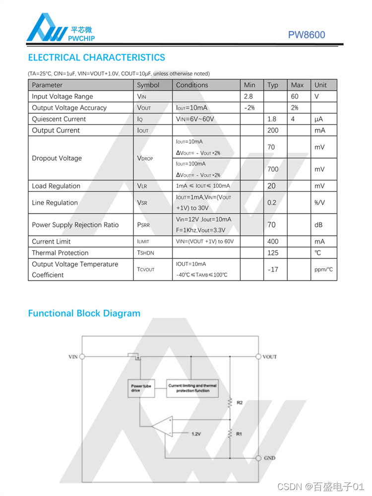 平芯微PWCHIPPW860080V高输入电压LDO线性稳压器概述PW8600系列专为功率敏感应用而设计。它包括一个精密高压输入级、一个超电流支路,并产生一个超低压差线性调节器。PW8600的输入电压为VOUT+1V至65V,仅消耗1.8UA静态电流,并提供1个初始精度和低压差,10MAPW8600通常为70mv。它是一个固定输出LDO,可提供3V至5.0V的可用电压。其他功能包括短路保护和热关断。8UA(典型输出精度高输出电流:=200A系统启动无过冲短路保护设计无过冲卓越的功率负载瞬态响应低温系数:100ppm/C包装:S0T23-3APPLICATIONSattery-powered equipment烟雾探测器和传感器智能电表