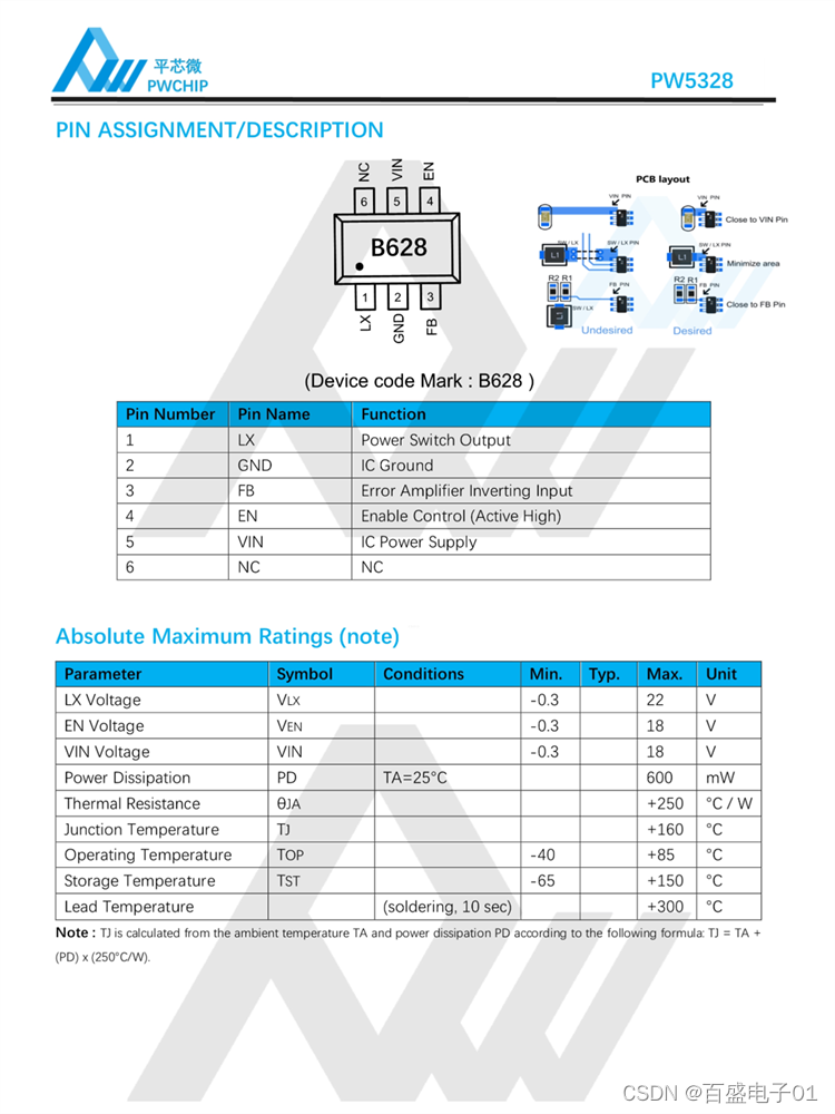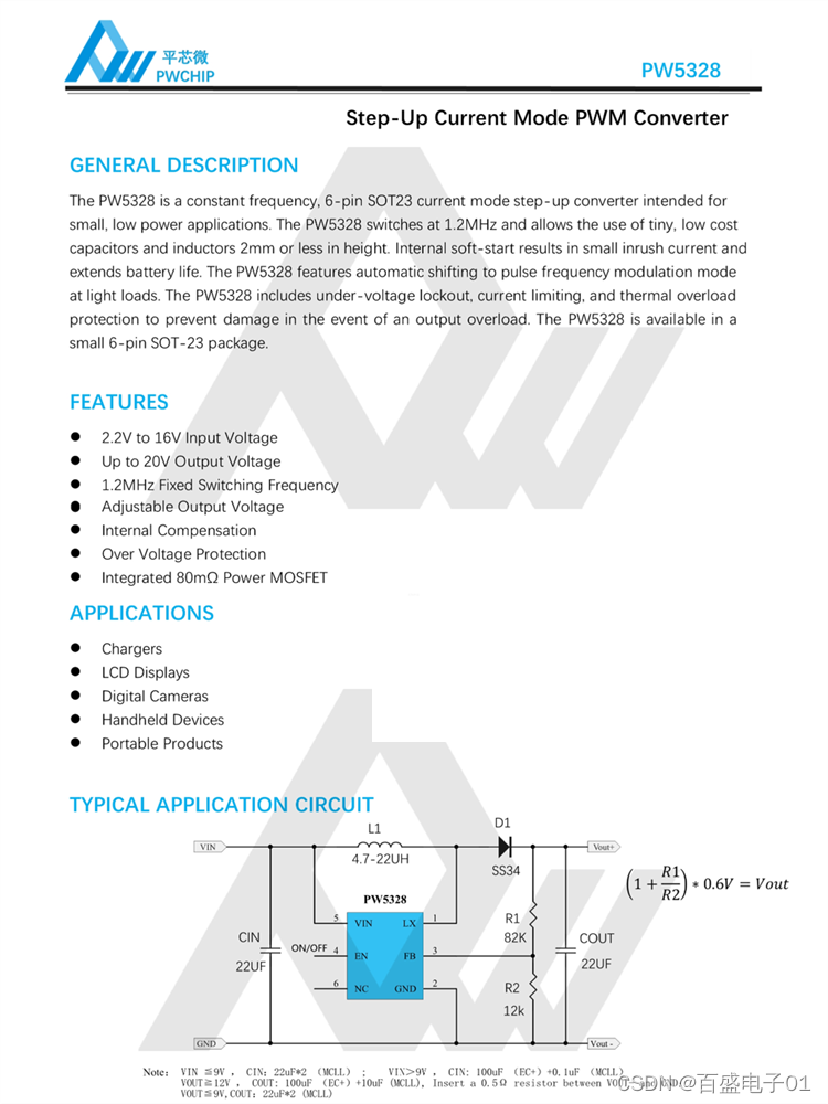 PW5328是一款专为小型低功耗应用设计的6引脚SOT23转换器,具有1.2MHz固定频率、高达20V的输出电压和内置保护功能,适用于充电器、LCD等便携式设备。