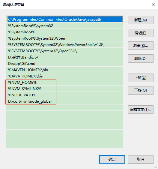 然后在path里面添加 ,在新版的NVM_HOME和NVM_SYMLINK在安装时都会自动添加不需要再重复安装了,需要添加的都标红了,但是如果你的环境变量没有需要添加上。