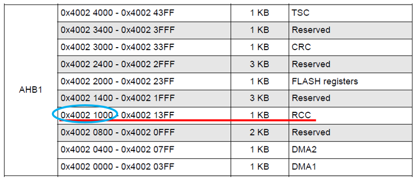 再次从器件手册中查到RCC模块的地址区间,如图所示: