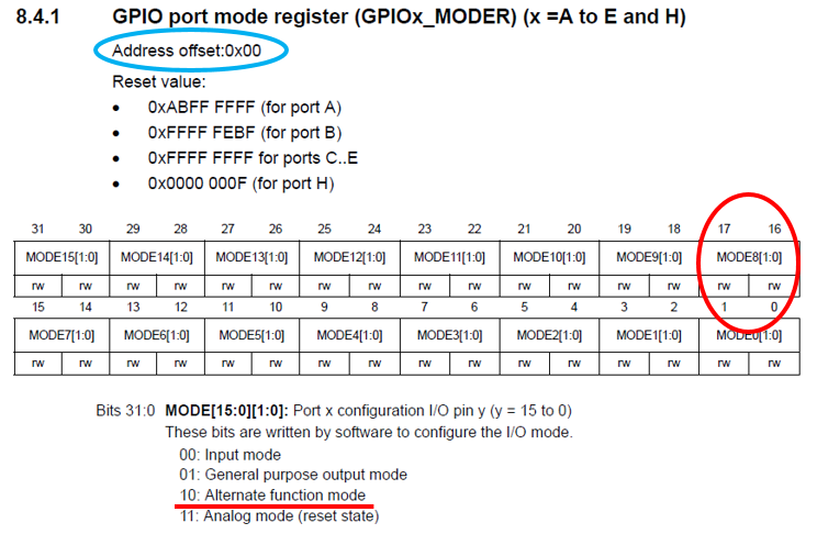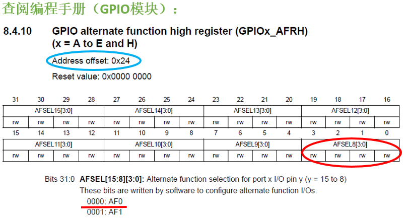 蓝色圆圈处表示GPIOx_AFRH相对于GPIOA基地址的偏移量是0x24,红色圆圈处的4个bit用来设置PA8的复用功能,红线处表示AF0的设置值为b0000。实现代码如下: