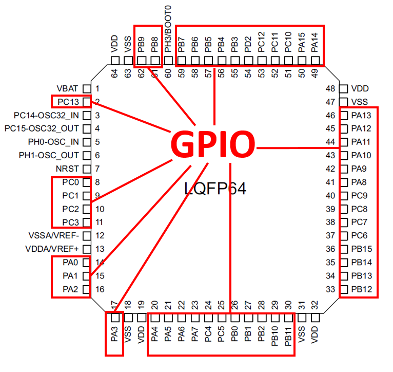 以STM32L431这颗芯片为例,下图是芯片的引脚图,红线标记的引脚就是GPIO引脚,单片机就是